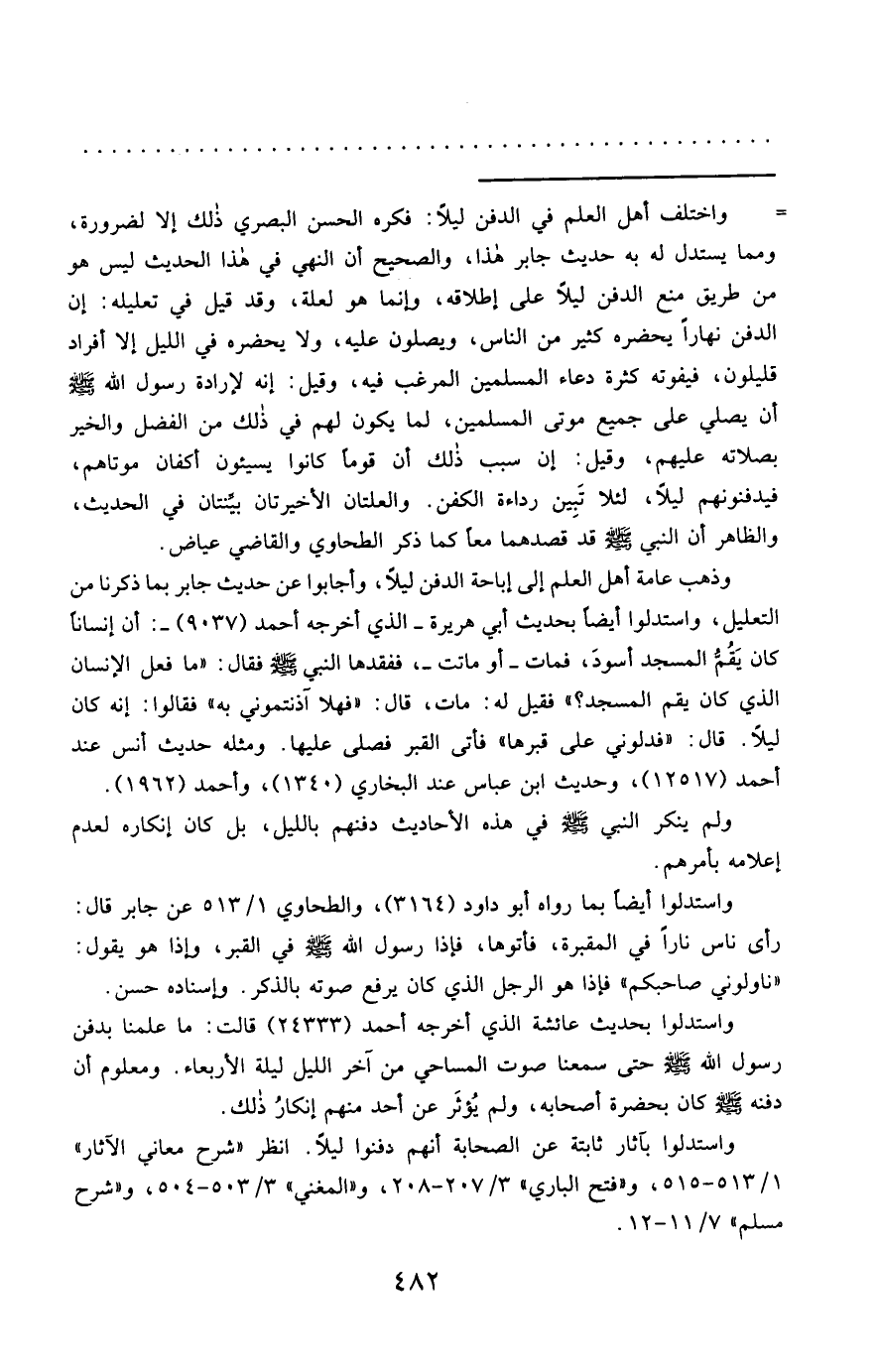 واستدلوا بآثار ثابتة عن الصحابة أنهم دفنوا ليلًا. انظر "شرح معاني الآثار" 1/ 513 - 515، و"فتح الباري" 3/ 207 - 208، و"المغني" 3/ 503 - 504، و"شرح مسلم" 7/ 11 - 12.