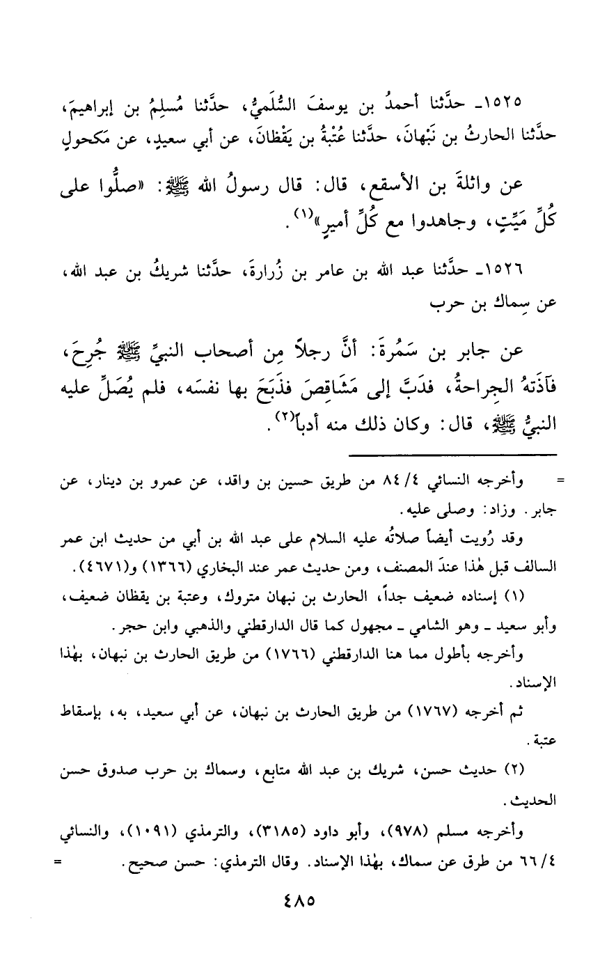 1526- حَدَّثَنَا عَبْدُ اللهِ بْنُ عَامِرِ بْنِ زُرَارَةَ ، حَدَّثَنَا شَرِيكُ بْنُ عَبْدِ اللهِ ، عَنْ سِمَاكِ بْنِ حَرْبٍ ، عَنْ جَابِرِ بْنِ سَمُرَةَ ، أَنَّ رَجُلاً مِنْ أَصْحَابِ النَّبِيِّ صَلَّى الله عَليْهِ وسَلَّمَ جُرِحَ ، فَآذَتْهُ الْجِرَاحَةُ ، فَدَبَّ إِلَى مَشَاقِصَ ، فَذَبَحَ بِهَا نَفْسَهُ , فَلَمْ يُصَلِّ عَلَيْهِ النَّبِيُّ صَلَّى الله عَليْهِ وسَلَّمَ , قَالَ : وَكَانَ ذَلِكَ مِنْهُ أَدَبًا.