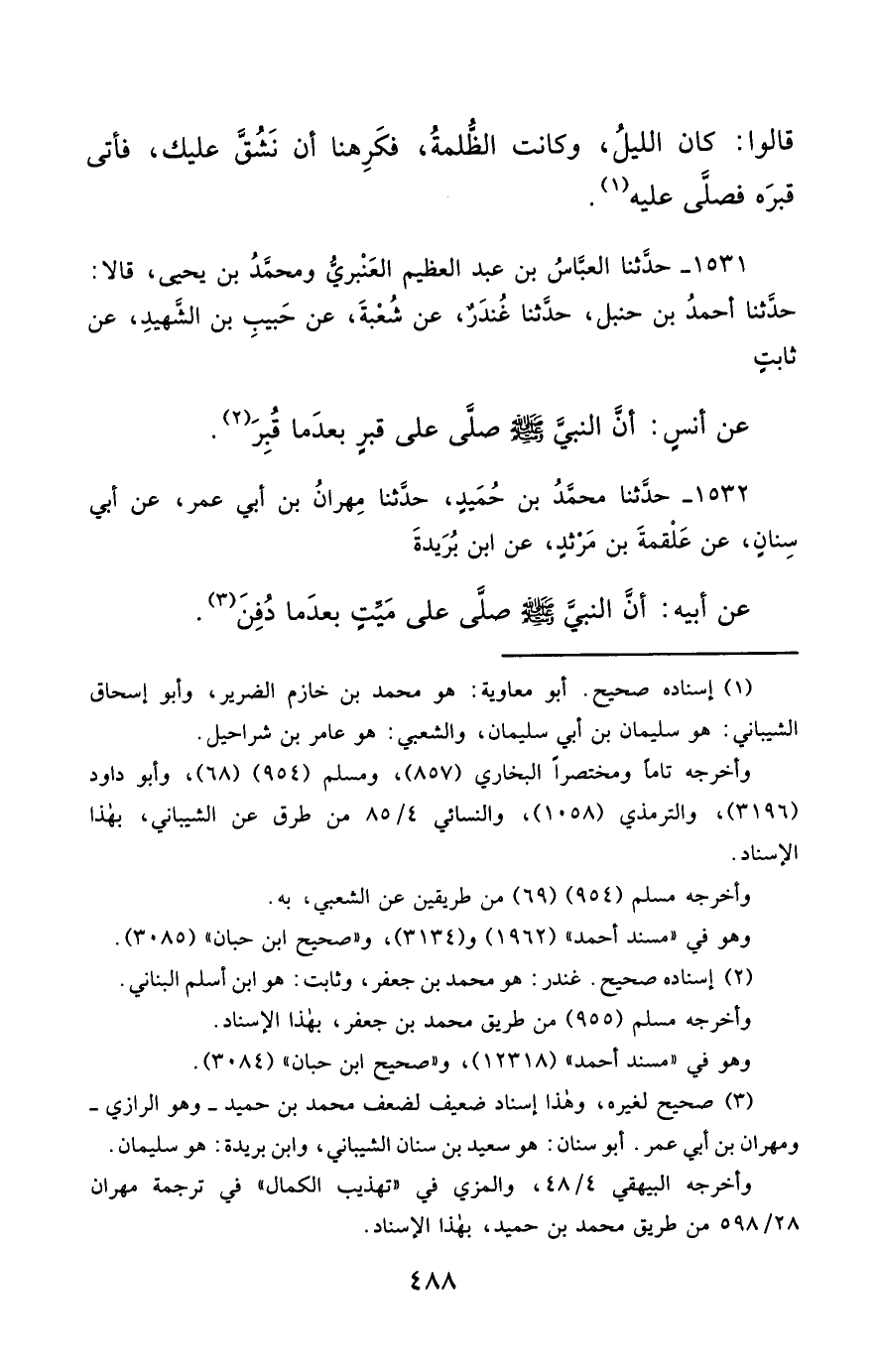 1531- حَدَّثَنَا الْعَبَّاسُ بْنُ عَبْدِ الْعَظِيمِ الْعَنْبَرِيُّ ، وَمُحَمَّدُ بْنُ يَحْيَى ، قَالاَ : حَدَّثَنَا أَحْمَدُ بْنُ حَنْبَلٍ ، حَدَّثَنَا غُنْدَرٌ ، عَنْ شُعْبَةَ ، عَنْ حَبِيبِ بْنِ الشَّهِيدِ ، عَنْ ثَابِتٍ ، عَنْ أَنَسٍ ، أَنَّ النَّبِيَّ صَلَّى الله عَليْهِ وسَلَّمَ صَلَّى عَلَى قَبْرٍ بَعْدَ مَا قُبِرَ.