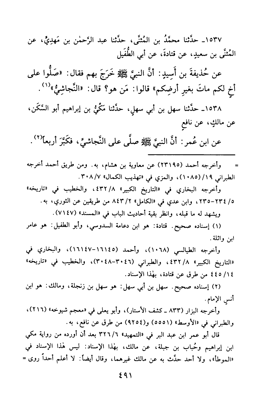 1537- حَدَّثَنَا مُحَمَّدُ بْنُ الْمُثَنَّى ، حَدَّثَنَا عَبْدُ الرَّحْمَنِ بْنُ مَهْدِيٍّ ، عَنِ الْمُثَنَّى بْنِ سَعِيدٍ ، عَنْ قَتَادَةَ ، عَنْ أَبِي الطُّفَيْلِ ، عَنْ حُذَيْفَةَ بْنِ أَسِيدٍ ، أَنَّ النَّبِيَّ صَلَّى الله عَليْهِ وسَلَّمَ خَرَجَ بِهِمْ فَقَالَ : صَلُّوا عَلَى أَخٍ لَكُمْ مَاتَ بِغَيْرِ أَرْضِكُمْ , قَالُوا : مَنْ هُوَ ؟ قَالَ : النَّجَاشِيُّ.