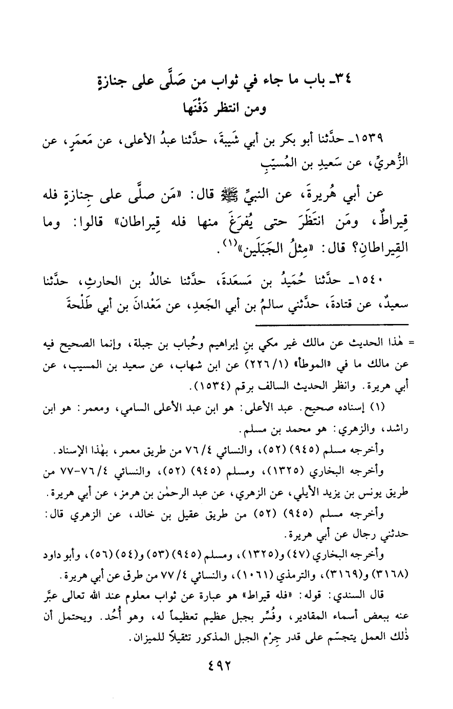 1539- حَدَّثَنَا أَبُو بَكْرِ بْنُ أَبِي شَيْبَةَ ، حَدَّثَنَا عَبْدُ الأَعْلَى ، عَنْ مَعْمَرٍ ، عَنِ الزُّهْرِيِّ ، عَنْ سَعِيدِ بْنِ الْمُسَيَّبِ ، عَنْ أَبِي هُرَيْرَةَ ، عَنِ النَّبِيِّ صَلَّى الله عَليْهِ وسَلَّمَ قَالَ : مَنْ صَلَّى عَلَى جِنَازَةٍ فَلَهُ قِيرَاطٌ ، وَمَنِ انْتَظَرَ حَتَّى يُفْرَغَ مِنْهَا فَلَهُ قِيرَاطَانِ , قَالُوا : وَمَا الْقِيرَاطَانِ ؟ قَالَ : مِثْلُ الْجَبَلَيْنِ.