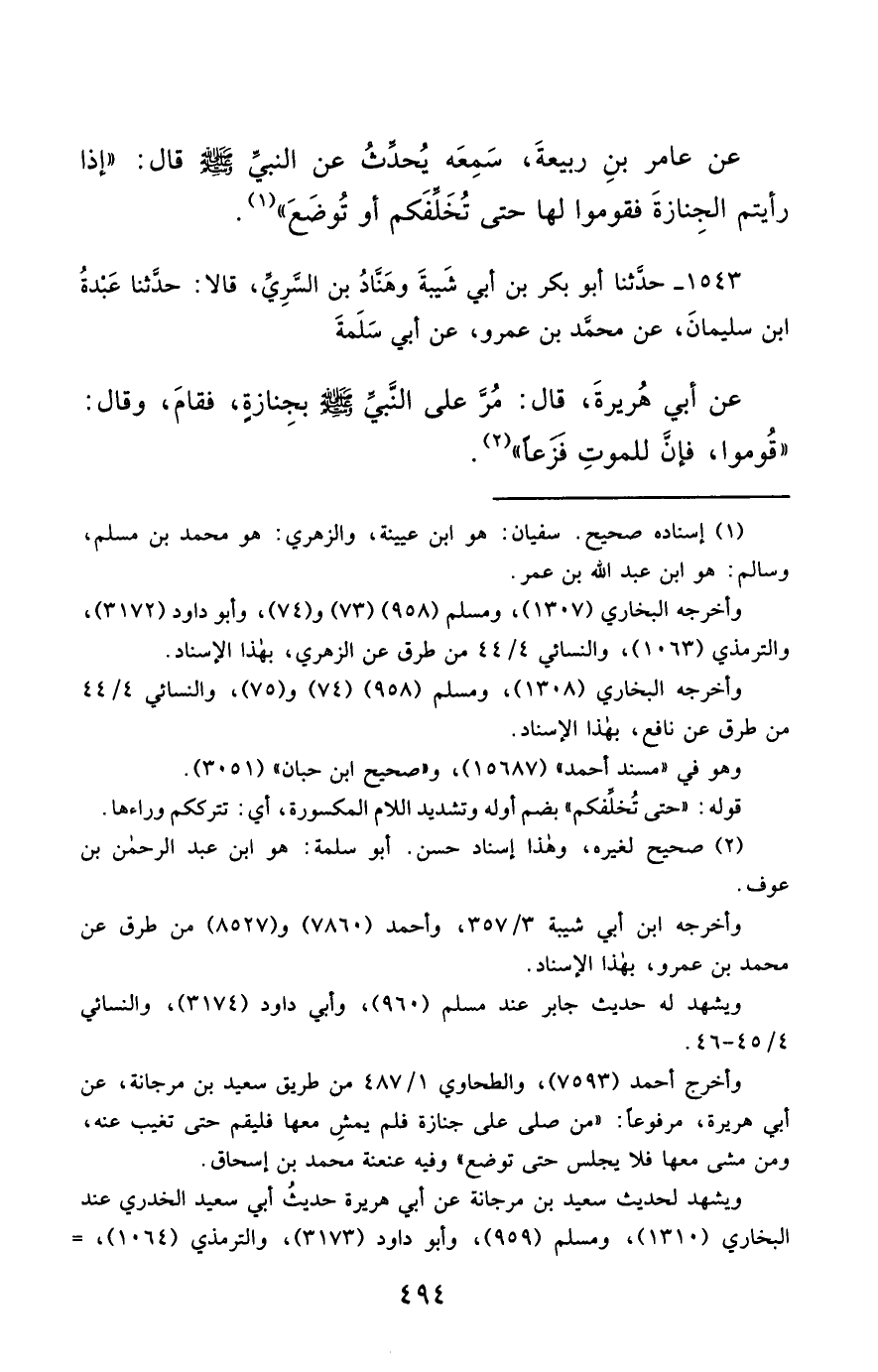1543- حَدَّثَنَا أَبُو بَكْرِ بْنُ أَبِي شَيْبَةَ ، وَهَنَّادُ بْنُ السَّرِيِّ ، قَالاَ : حَدَّثَنَا عَبْدَةُ بْنُ سُلَيْمَانَ ، عَنْ مُحَمَّدِ بْنِ عَمْرٍو ، عَنْ أَبِي سَلَمَةَ ، عَنْ أَبِي هُرَيْرَةَ ، قَالَ : مُرَّ عَلَى النَّبِيِّ صَلَّى الله عَليْهِ وسَلَّمَ بِجِنَازَةٍ ، فَقَامَ , وَقَالَ : قُومُوا ؛ فَإِنَّ لِلْمَوْتِ فَزَعًا.