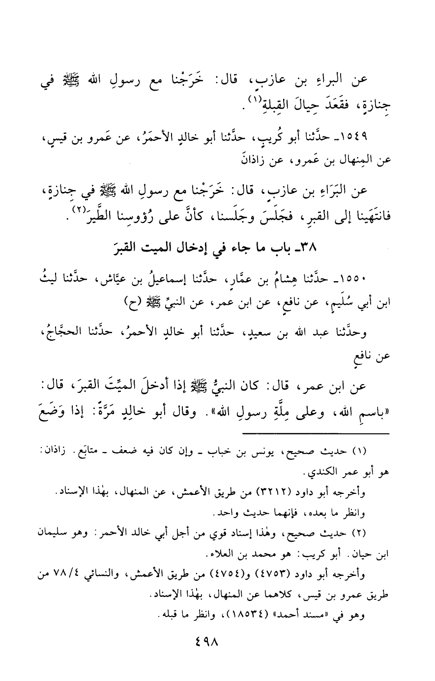 1549- حَدَّثَنَا أَبُو كُرَيْبٍ ، حَدَّثَنَا أَبُو خَالِدٍ الأَحْمَرُ ، عَنْ عَمْرِو بْنِ قَيْسٍ ، عَنِ الْمِنْهَالِ بْنِ عَمْرٍو ، عَنْ زَاذَانَ ، عَنِ الْبَرَاءِ بْنِ عَازِبٍ ، قَالَ : خَرَجْنَا مَعَ رَسُولِ اللهِ صَلَّى الله عَليْهِ وسَلَّمَ فِي جِنَازَةٍ ، فَانْتَهَيْنَا إِلَى الْقَبْرِ , فَجَلَسَ ، وَجَلَسْنَا ، كَأَنَّ عَلَى رُؤُوسِنَا الطَّيْرَ.