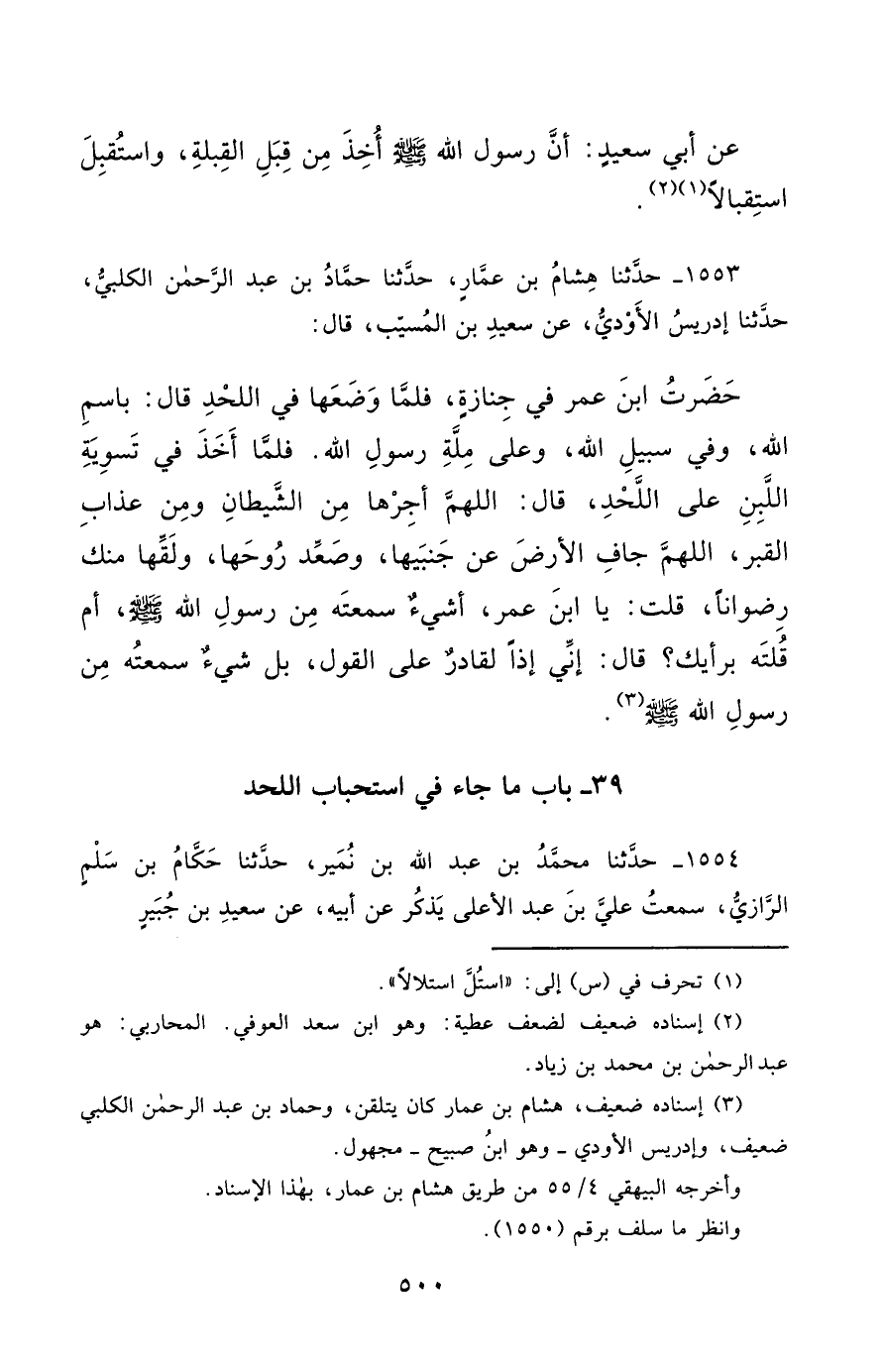1554- حَدَّثَنَا مُحَمَّدُ بْنُ عَبْدِ اللهِ بْنِ نُمَيْرٍ ، حَدَّثَنَا حَكَّامُ بْنُ سَلْمٍ الرَّازِيُّ ، سَمِعْتُ عَلِيَّ بْنَ عَبْدِ الأَعْلَى يَذْكُرُ عَنْ أَبِيهِ ، عَنْ سَعِيدِ بْنِ جُبَيْرٍ ، عَنِ ابْنِ عَبَّاسٍ ، قَالَ : قَالَ رَسُولُ اللهِ صَلَّى الله عَليْهِ وسَلَّمَ : اللَّحْدُ لَنَا ، وَالشَّقُّ لِغَيْرِنَا.