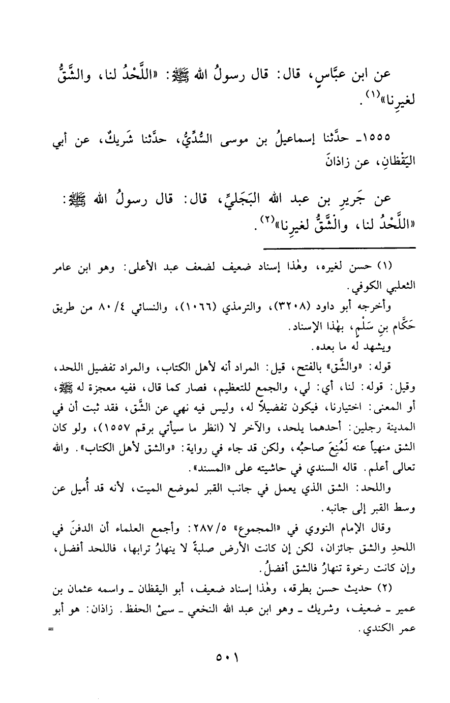 1555- حَدَّثَنَا إِسْمَاعِيلُ بْنُ مُوسَى السُّدِّيُّ ، حَدَّثَنَا شَرِيكٌ ، عَنْ أَبِي الْيَقْظَانِ ، عَنْ زَاذَانَ ، عَنْ جَرِيرِ بْنِ عَبْدِ اللهِ الْبَجَلِيِّ ، قَالَ : قَالَ رَسُولُ اللهِ صَلَّى الله عَليْهِ وسَلَّمَ : اللَّحْدُ لَنَا ، وَالشَّقُّ لِغَيْرِنَا.