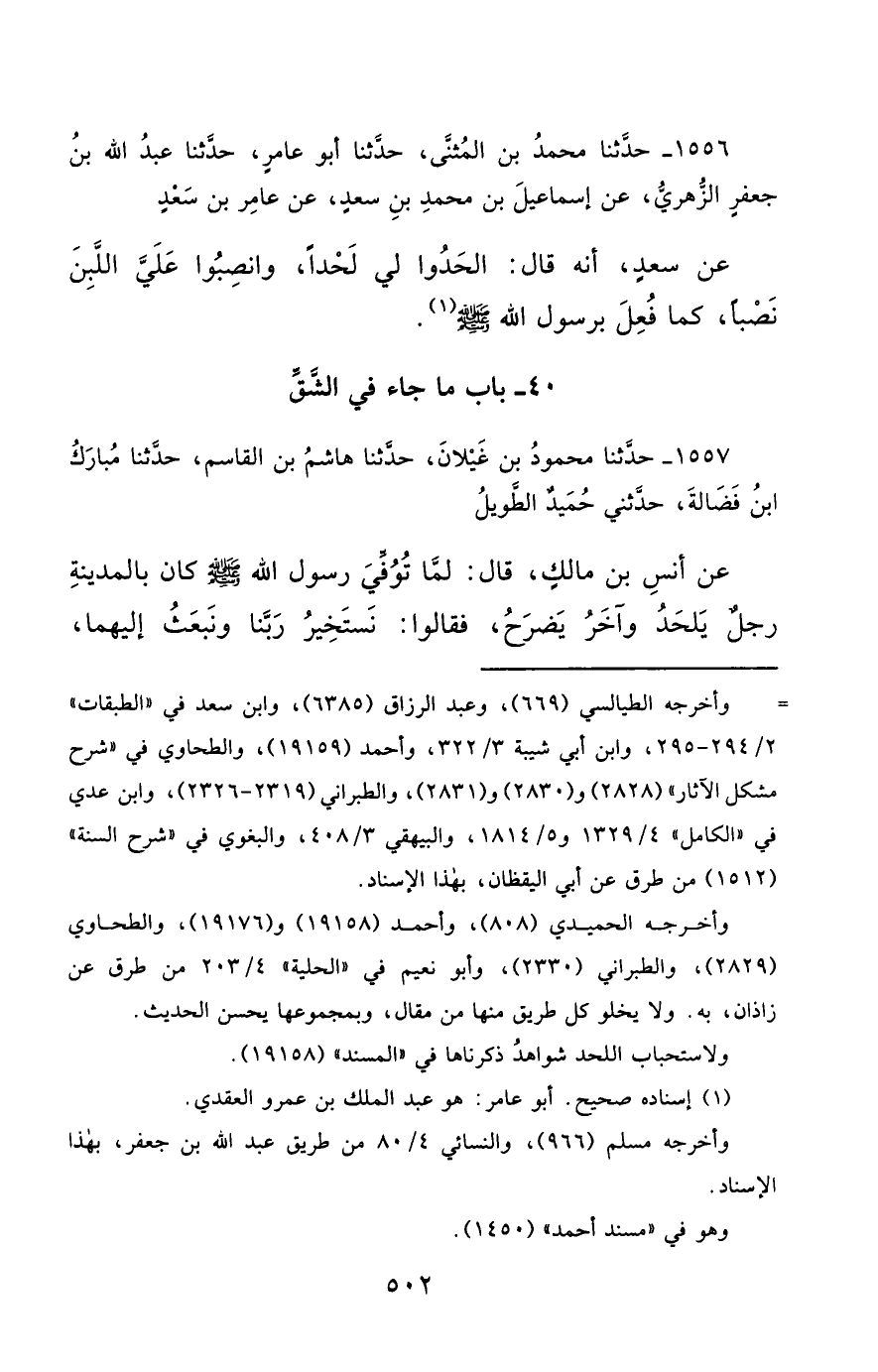 1556- حَدَّثَنَا مُحَمَّدُ بْنُ الْمُثَنَّى ، حَدَّثَنَا أَبُو عَامِرٍ ، حَدَّثَنَا عَبْدُ اللهِ بْنُ جَعْفَرٍ الزُّهْرِيُّ ، عَنْ إِسْمَاعِيلَ بْنِ مُحَمَّدِ بْنِ سَعْدٍ ، عَنْ عَامِرِ بْنِ سَعْدٍ ، عَنْ سَعْدٍ ، أَنَّهُ قَالَ : الْحَدُوا لِي لَحْدًا ، وَانْصِبُوا عَلَيَّ اللَّبِنِ نَصْبًا ، كَمَا فُعِلَ بِرَسُولِ اللهِ صَلَّى الله عَليْهِ وسَلَّمَ.