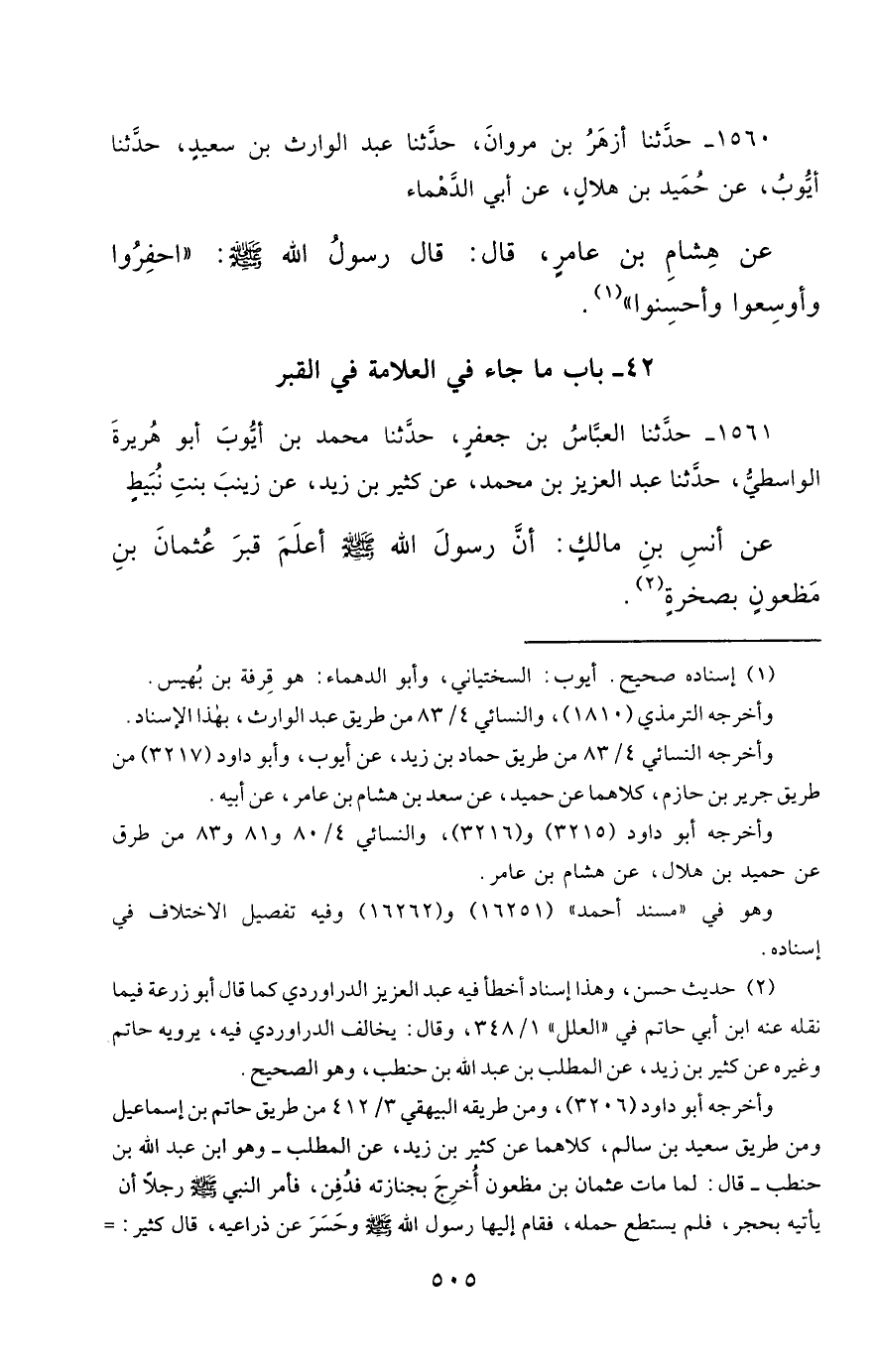 1560- حَدَّثَنَا أَزْهَرُ بْنُ مَرْوَانَ ، حَدَّثَنَا عَبْدُ الْوَارِثِ بْنُ سَعِيدٍ ، حَدَّثَنَا أَيُّوبُ ، عَنْ حُمَيْدِ بْنِ هِلاَلٍ ، عَنْ أَبِي الدَّهْمَاءِ ، عَنْ هِشَامِ بْنِ عَامِرٍ ، قَالَ : قَالَ رَسُولُ اللهِ صَلَّى الله عَليْهِ وسَلَّمَ : احْفِرُوا ، وَأَوْسِعُوا ، وَأَحْسِنُوا.