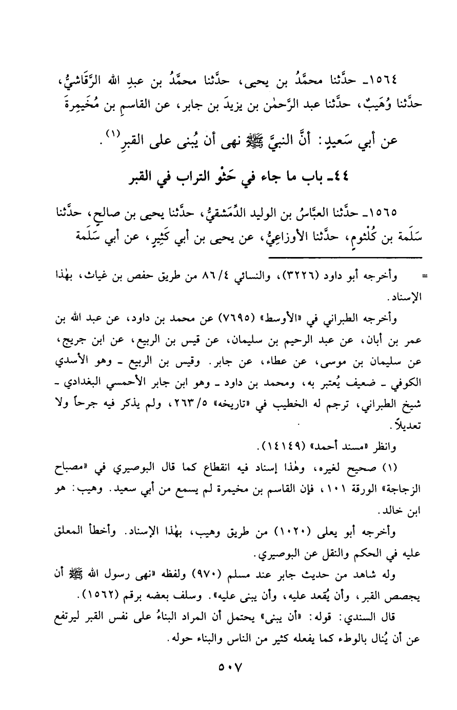 1564- حَدَّثَنَا مُحَمَّدُ بْنُ يَحْيَى ، حَدَّثَنَا مُحَمَّدُ بْنُ عَبْدِ اللهِ الرَّقَاشِيُّ ، حَدَّثَنَا وُهَيْبٌ ، حَدَّثَنَا عَبْدُ الرَّحْمَنِ بْنُ يَزِيدَ بْنِ جَابِرٍ ، عَنِ الْقَاسِمِ بْنِ مُخَيْمِرَةَ ، عَنْ أَبِي سَعِيدٍ ، أَنَّ النَّبِيَّ صَلَّى الله عَليْهِ وسَلَّمَ نَهَى أَنْ يُبْنَى عَلَى الْقَبْرِ.