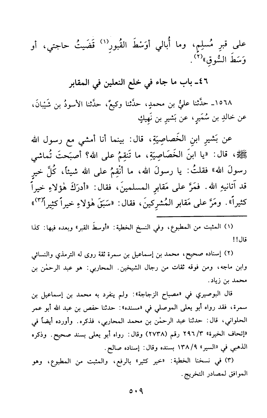 1568- حَدَّثَنَا عَلِيُّ بْنُ مُحَمَّدٍ ، حَدَّثَنَا وَكِيعٌ ، حَدَّثَنَا الأَسْوَدُ بْنُ شَيْبَانَ ، عَنْ خَالِدِ بْنِ سُمَيْرٍ ، عَنْ بَشِيرِ بْنِ نَهِيكٍ ، عَنْ بَشِيرِ ابْنِ الْخَصَاصِيَةِ ، قَالَ : بَيْنَمَا أَنَا أَمْشِي مَعَ رَسُولِ اللهِ صَلَّى الله عَليْهِ وسَلَّمَ ، قَالَ : يَا ابْنَ الْخَصَاصِيَّةِ , مَا تَنْقِمُ عَلَى اللهِ ؟ أَصْبَحْتَ تُمَاشِي رَسُولَ اللهِ , فَقُلْتُ : يَا رَسُولَ اللهِ ، مَا أَنْقِمُ عَلَى اللهِ شَيْئًا ، كُلَّ خَيْرٍ قَدْ آتَانِيهِ اللَّهُ ، فَمَرَّ عَلَى مَقَابِرِ الْمُسْلِمِينَ ، فَقَالَ : أَدْرَكَ هَؤُلاَءِ خَيْرًا كَثِيرًا , وَمَرَّ عَلَى مَقَابِرِ الْمُشْرِكِينَ ، فَقَالَ : سَبَقَ هَؤُلاَءِ خَيْرًا كَثِيرًا , قَالَ : فَالْتَفَتَ ، فَرَأَى رَجُلاً يَمْشِي بَيْنَ الْمَقَابِرِ فِي نَعْلَيْهِ ، فَقَالَ : يَا صَاحِبَ السِّبْتِيَّتَيْنِ أَلْقِهِمَا.