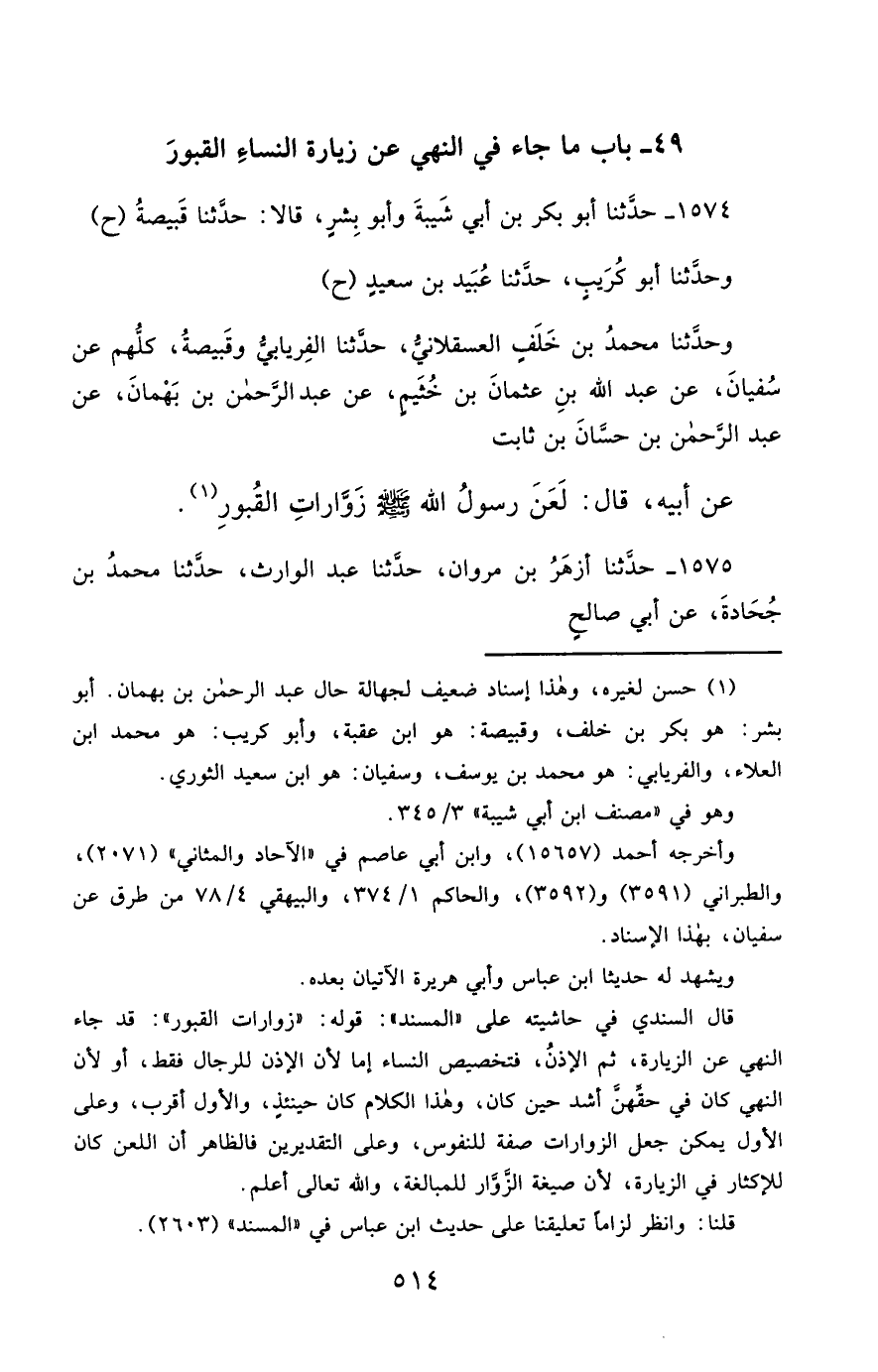 1574- حَدَّثَنَا أَبُو بَكْرِ بْنُ أَبِي شَيْبَةَ ، وَأَبُو بِشْرٍ , قَالاَ : حَدَّثَنَا قَبِيصَةُ (ح) وحَدَّثَنَا أَبُو كُرَيْبٍ ، حَدَّثَنَا عُبَيْدُ بْنُ سَعِيدٍ (ح) وحَدَّثَنَا مُحَمَّدُ بْنُ خَلَفٍ الْعَسْقَلاَنِيُّ ، حَدَّثَنَا الْفِرْيَابِيُّ ، وَقَبِيصَةُ ؛ كُلُّهُمْ عَنْ سُفْيَانَ ، عَنْ عَبْدِ اللهِ بْنِ عُثْمَانَ بْنِ خُثَيْمٍ ، عَنْ عَبْدِ الرَّحْمَنِ بْنِ بَهْمَانَ ، عَنْ عَبْدِ الرَّحْمَنِ بْنِ حَسَّانَ بْنِ ثَابِتٍ ، عَنْ أَبِيهِ ، قَالَ : لَعَنَ رَسُولُ اللهِ صَلَّى الله عَليْهِ وسَلَّمَ زَوَّارَاتِ الْقُبُورِ.