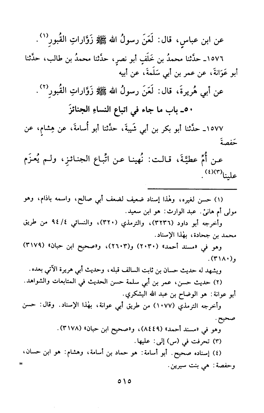 1576- حَدَّثَنَا مُحَمَّدُ بْنُ خَلَفٍ أَبُو نَصْرٍ ، حَدَّثَنَا مُحَمَّدُ بْنُ طَالِبٍ ، حَدَّثَنَا أَبُو عَوَانَةَ ، عَنْ عُمَرَ بْنِ أَبِي سَلَمَةَ ، عَنْ أَبِيهِ ، عَنْ أَبِي هُرَيْرَةَ ، قَالَ : لَعَنَ رَسُولُ اللهِ صَلَّى الله عَليْهِ وسَلَّمَ زَوَّارَاتِ الْقُبُورِ.