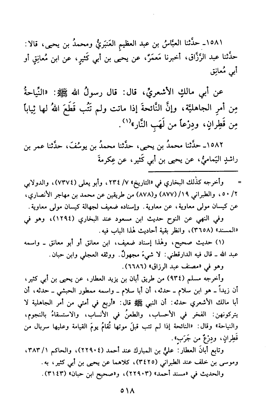 1581- حَدَّثَنَا الْعَبَّاسُ بْنُ عَبْدِ الْعَظِيمِ الْعَنْبَرِيُّ ، وَمُحَمَّدُ بْنُ يَحْيَى ، قَالاَ : حَدَّثَنَا عَبْدُ الرَّزَّاقِ ، أَخْبَرَنَا مَعْمَرٌ ، عَنْ يَحْيَى بْنِ أَبِي كَثِيرٍ ، عَنِ ابْنِ مُعَانِقٍ أَوْ أَبِي مُعَانِقٍ ، عَنْ أَبِي مَالِكٍ الأَشْعَرِيِّ ، قَالَ : قَالَ رَسُولُ اللهِ صَلَّى الله عَليْهِ وسَلَّمَ : النِّيَاحَةُ مِنْ أَمْرِ الْجَاهِلِيَّةِ ، وَإِنَّ النَّائِحَةَ إِذَا مَاتَتْ ، وَلَمْ تَتُبْ ، قَطَعَ اللَّهُ لَهَا ثِيَابًا مِنْ قَطِرَانٍ ، وَدِرْعًا مِنْ لَهَبِ النَّارِ.