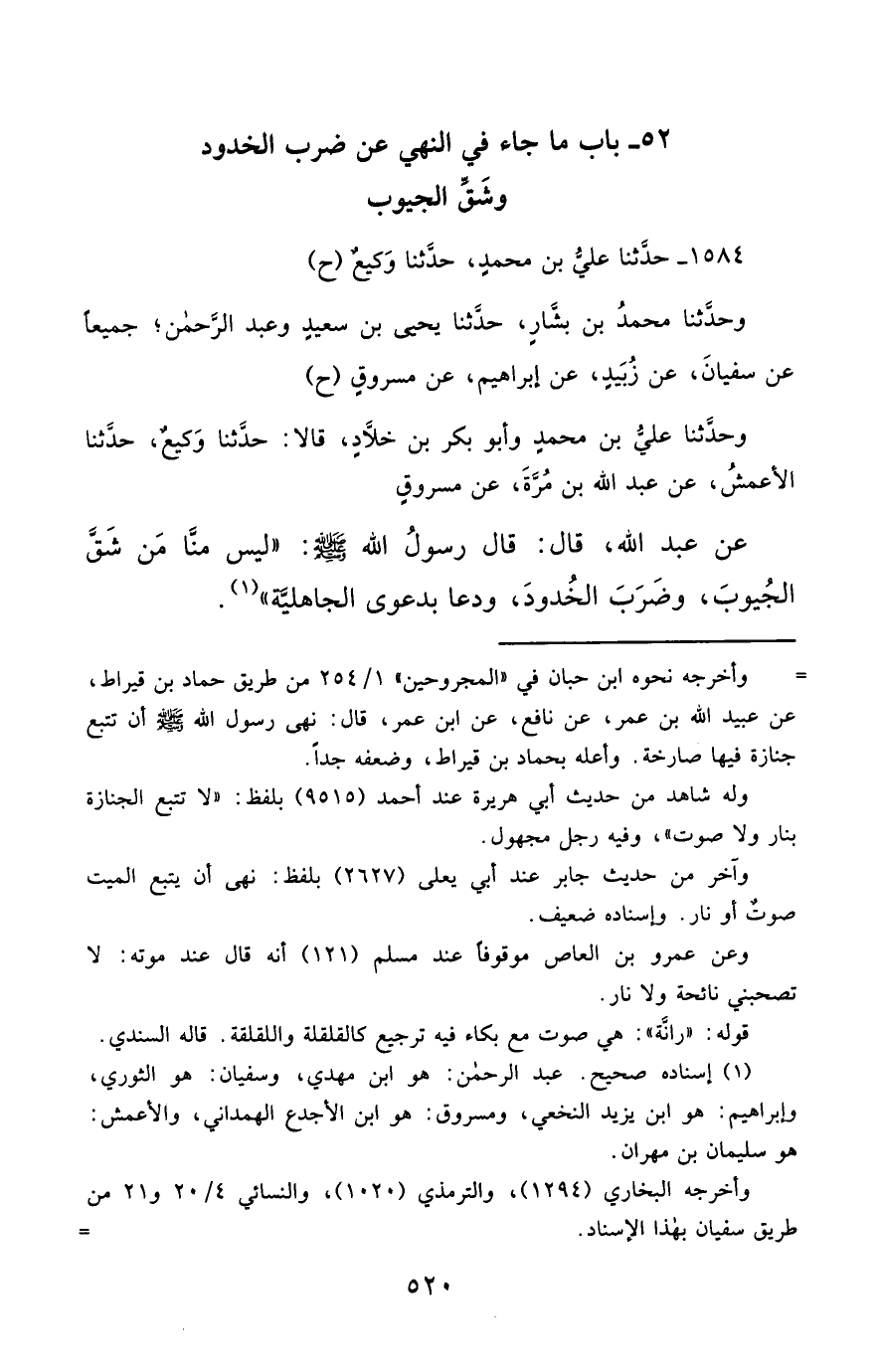 1584- حَدَّثَنَا عَلِيُّ بْنُ مُحَمَّدٍ ، حَدَّثَنَا وَكِيعٌ (ح) وحَدَّثَنَا مُحَمَّدُ بْنُ بَشَّارٍ ، حَدَّثَنَا يَحْيَى بْنُ سَعِيدٍ ، وَعَبْدُ الرَّحْمَنِ ؛ جَمِيعًا عَنْ سُفْيَانَ ، عَنْ زُبَيْدٍ ، عَنْ إِبْرَاهِيمَ ، عَنْ مَسْرُوقٍ (ح) وحَدَّثَنَا عَلِيُّ بْنُ مُحَمَّدٍ ، وَأَبُو بَكْرِ بْنُ خَلاَّدٍ ، قَالاَ : حَدَّثَنَا وَكِيعٌ ، حَدَّثَنَا الأَعْمَشُ ، عَنْ عَبْدِ اللهِ بْنِ مُرَّةَ ، عَنْ مَسْرُوقٍ ، عَنْ عَبْدِ اللهِ ، قَالَ : قَالَ رَسُولُ اللهِ صَلَّى الله عَليْهِ وسَلَّمَ : لَيْسَ مِنَّا مَنْ شَقَّ الْجُيُوبَ ، وَضَرَبَ الْخُدُودَ ، وَدَعَا بِدَعْوَى الْجَاهِلِيَّةِ.