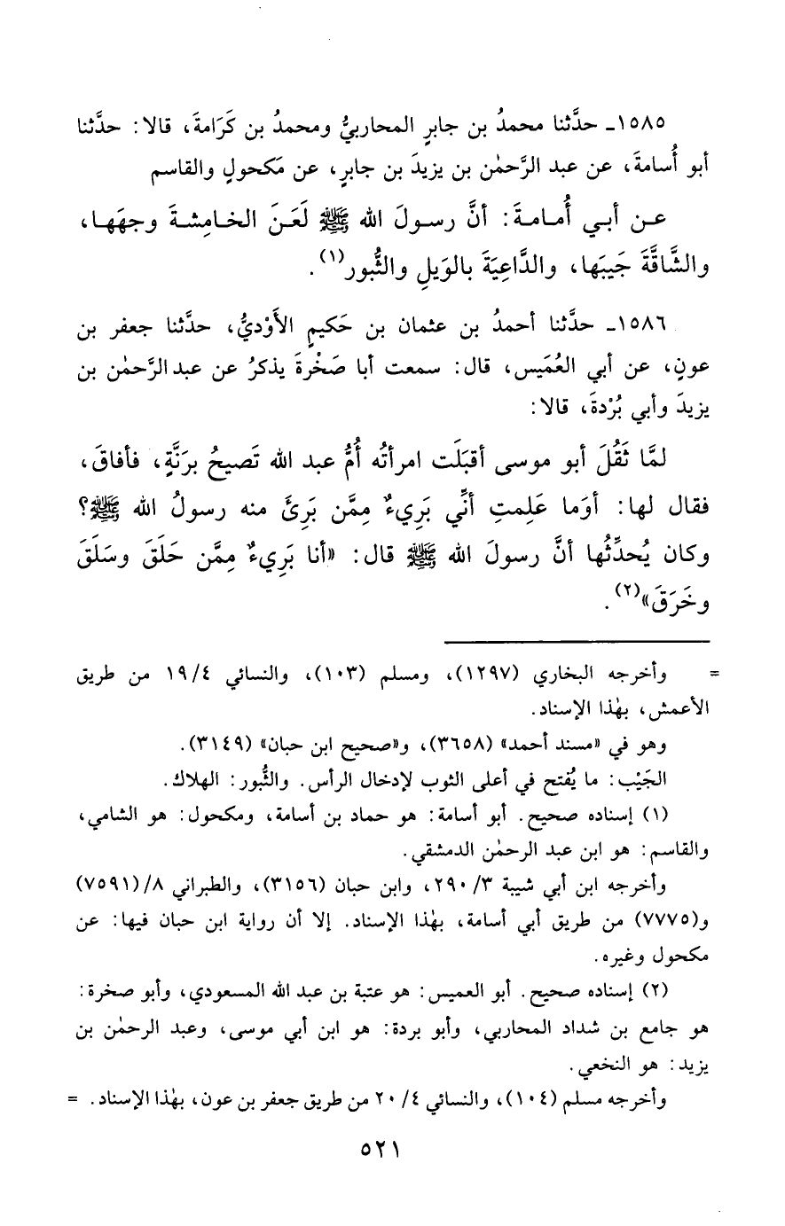 1585- حَدَّثَنَا مُحَمَّدُ بْنُ جَابِرٍ الْمُحَارِبِيُّ ، وَمُحَمَّدُ بْنُ كَرَامَةَ ، قَالاَ : حَدَّثَنَا أَبُو أُسَامَةَ ، عَنْ عَبْدِ الرَّحْمَنِ بْنِ يَزِيدَ بْنِ جَابِرٍ ، عَنْ مَكْحُولٍ ، وَالْقَاسِمِ ، عَنْ أَبِي أُمَامَةَ ، أَنَّ رَسُولَ اللهِ صَلَّى الله عَليْهِ وسَلَّمَ لَعَنَ الْخَامِشَةَ وَجْهَهَا ، وَالشَّاقَّةَ جَيْبَهَا ، وَالدَّاعِيَةَ بِالْوَيْلِ وَالثُّبُورِ.