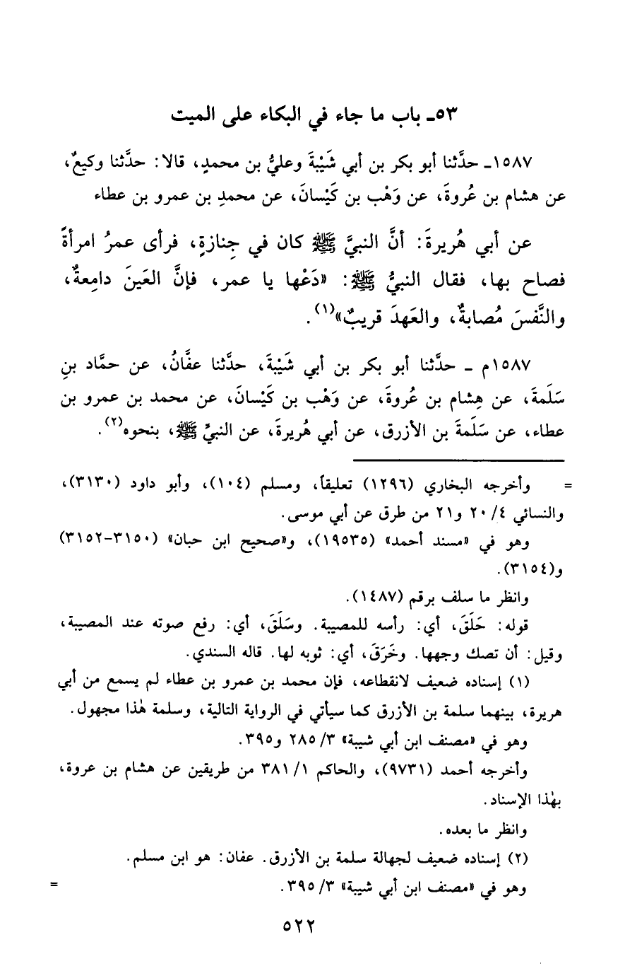 1587- حَدَّثَنَا أَبُو بَكْرِ بْنُ أَبِي شَيْبَةَ ، وَعَلِيُّ بْنُ مُحَمَّدٍ ، قَالاَ : حَدَّثَنَا وَكِيعٌ ، عَنْ هِشَامِ بْنِ عُرْوَةَ ، عَنْ وَهْبِ بْنِ كَيْسَانَ ، عَنْ مُحَمَّدِ بْنِ عَمْرِو بْنِ عَطَاءٍ ، عَنْ أَبِي هُرَيْرَةَ ، أَنَّ النَّبِيَّ صَلَّى الله عَليْهِ وسَلَّمَ كَانَ فِي جِنَازَةٍ ، فَرَأَى عُمَرُ امْرَأَةً ، فَصَاحَ بِهَا ، فَقَالَ النَّبِيُّ صَلَّى الله عَليْهِ وسَلَّمَ : دَعْهَا يَا عُمَرُ ، فَإِنَّ الْعَيْنَ دَامِعَةٌ ، وَالنَّفْسَ مُصَابَةٌ ، وَالْعَهْدَ قَرِيبٌ.