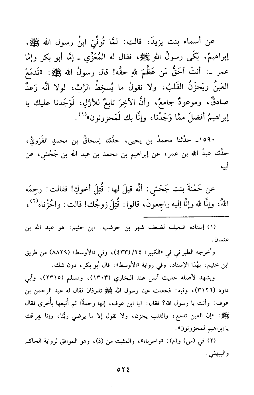 1590- حَدَّثَنَا مُحَمَّدُ بْنُ يَحْيَى ، حَدَّثَنَا إِسْحَاقُ بْنُ مُحَمَّدٍ الْفَرْوِيُّ ، حَدَّثَنَا عَبْدُ اللهِ بْنُ عُمَرَ ، عَنْ إِبْرَاهِيمَ بْنِ مُحَمَّدِ بْنِ عَبْدِ اللهِ بْنِ جَحْشٍ ، عَنْ أَبِيهِ ، عَنْ حَمْنَةَ بِنْتِ جَحْشٍ ، أَنَّهُ قِيلَ لَهَا : قُتِلَ أَخُوكِ ، فَقَالَتْ : رَحِمَهُ اللَّهُ ، وَإِنَّا لِلَّهِ وَإِنَّا إِلَيْهِ رَاجِعُونَ ، قَالُوا : قُتِلَ زَوْجُكِ ، قَالَتْ : وَاحُزْنَاهُ ، فَقَالَ رَسُولُ اللهِ صَلَّى الله عَليْهِ وسَلَّمَ : إِنَّ لِلزَّوْجِ مِنَ الْمَرْأَةِ لَشُعْبَةً ، مَا هِيَ لِشَيْءٍ.