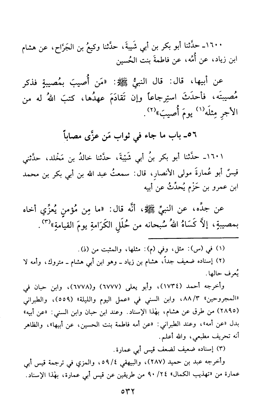 1600- حَدَّثَنَا أَبُو بَكْرِ بْنُ أَبِي شَيْبَةَ ، حَدَّثَنَا وَكِيعُ بْنُ الْجَرَّاحِ ، عَنْ هِشَامِ بْنِ زِيَادٍ ، عَنْ أُمِّهِ ، عَنْ فَاطِمَةَ بِنْتِ الْحُسَيْنِ ، عَنْ أَبِيهَا ، قَالَ : قَالَ النَّبِيُّ صَلَّى الله عَليْهِ وسَلَّمَ : مَنْ أُصِيبَ بِمُصِيبَةٍ ، فَذَكَرَ مُصِيبَتَهُ ، فَأَحْدَثَ اسْتِرْجَاعًا ، وَإِنْ تَقَادَمَ عَهْدُهَا ، كَتَبَ اللَّهُ لَهُ مِنَ الأَجْرِ مِثْلَهُ يَوْمَ أُصِيبَ.