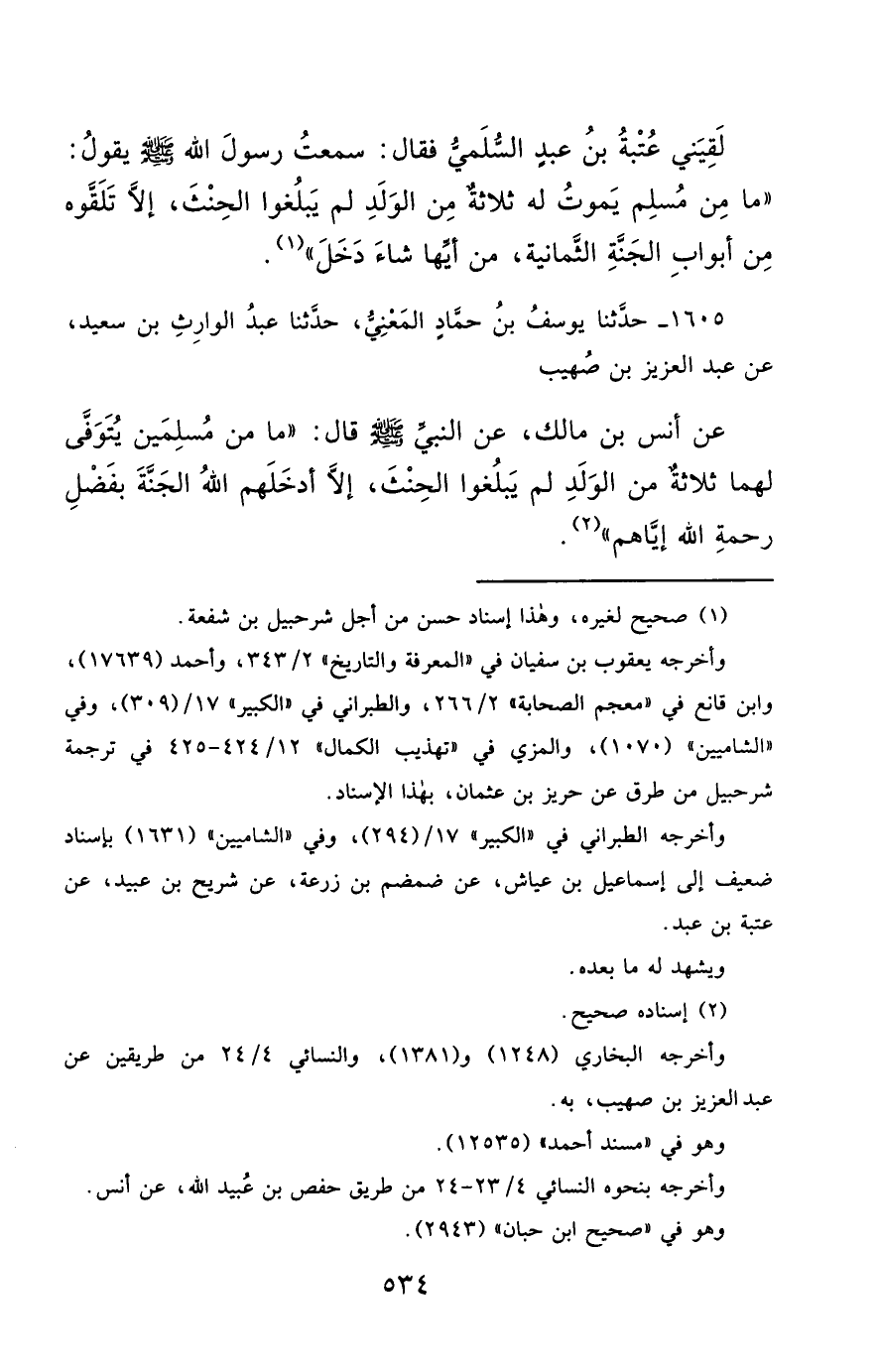 1605- حَدَّثَنَا يُوسُفُ بْنُ حَمَّادٍ الْمَعْنِيُّ ، حَدَّثَنَا عَبْدُ الْوَارِثِ بْنُ سَعِيدٍ ، عَنْ عَبْدِ الْعَزِيزِ بْنِ صُهَيْبٍ ، عَنْ أَنَسِ بْنِ مَالِكٍ ، عَنِ النَّبِيِّ صَلَّى الله عَليْهِ وسَلَّمَ قَالَ : مَا مِنْ مُسْلِمَيْنِ يُتَوَفَّى لَهُمَا ثَلاَثَةٌ مِنَ الْوَلَدِ لَمْ يَبْلُغُوا الْحِنْثَ ، إِلاَّ أَدْخَلَهُمُ اللَّهُ الْجَنَّةَ ، بِفَضْلِ رَحْمَةِ اللهِ إِيَّاهُمْ.