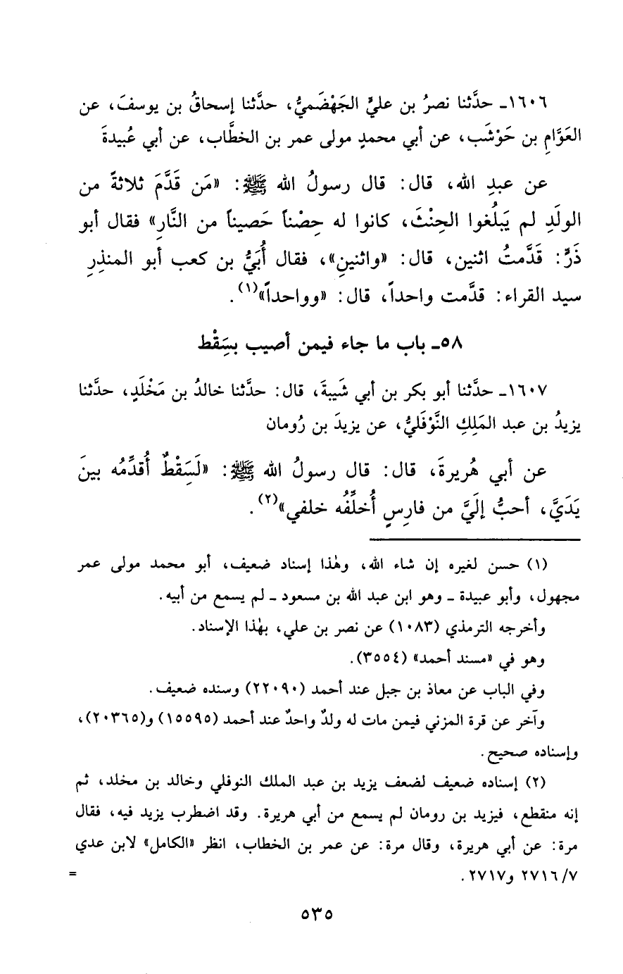 1606- حَدَّثَنَا نَصْرُ بْنُ عَلِيٍّ الْجَهْضَمِيُّ ، حَدَّثَنَا إِسْحَاقُ بْنُ يُوسُفَ ، عَنِ الْعَوَّامِ بْنِ حَوْشَبٍ ، عَنْ أَبِي مُحَمَّدٍ ، مَوْلَى عُمَرَ بْنِ الْخَطَّابِ , عَنْ أَبِي عُبَيْدَةَ ، عَنْ عَبْدِ اللهِ ، قَالَ : قَالَ رَسُولُ اللهِ صَلَّى الله عَليْهِ وسَلَّمَ : مَنْ قَدَّمَ ثَلاَثَةً مِنَ الْوَلَدِ لَمْ يَبْلُغُوا الْحِنْثَ ، كَانُوا لَهُ حِصْنًا حَصِينًا مِنَ النَّارِ , فَقَالَ أَبُو ذَرٍّ : قَدَّمْتُ اثْنَيْنِ ، قَالَ : وَاثْنَيْنِ , فَقَالَ أُبَيُّ بْنُ كَعْبٍ أَبُو الْمُنْذِرِ , سَيِّدُ الْقُرَّاءِ : قَدَّمْتُ وَاحِدًا ، قَالَ : وَوَاحِدًا.