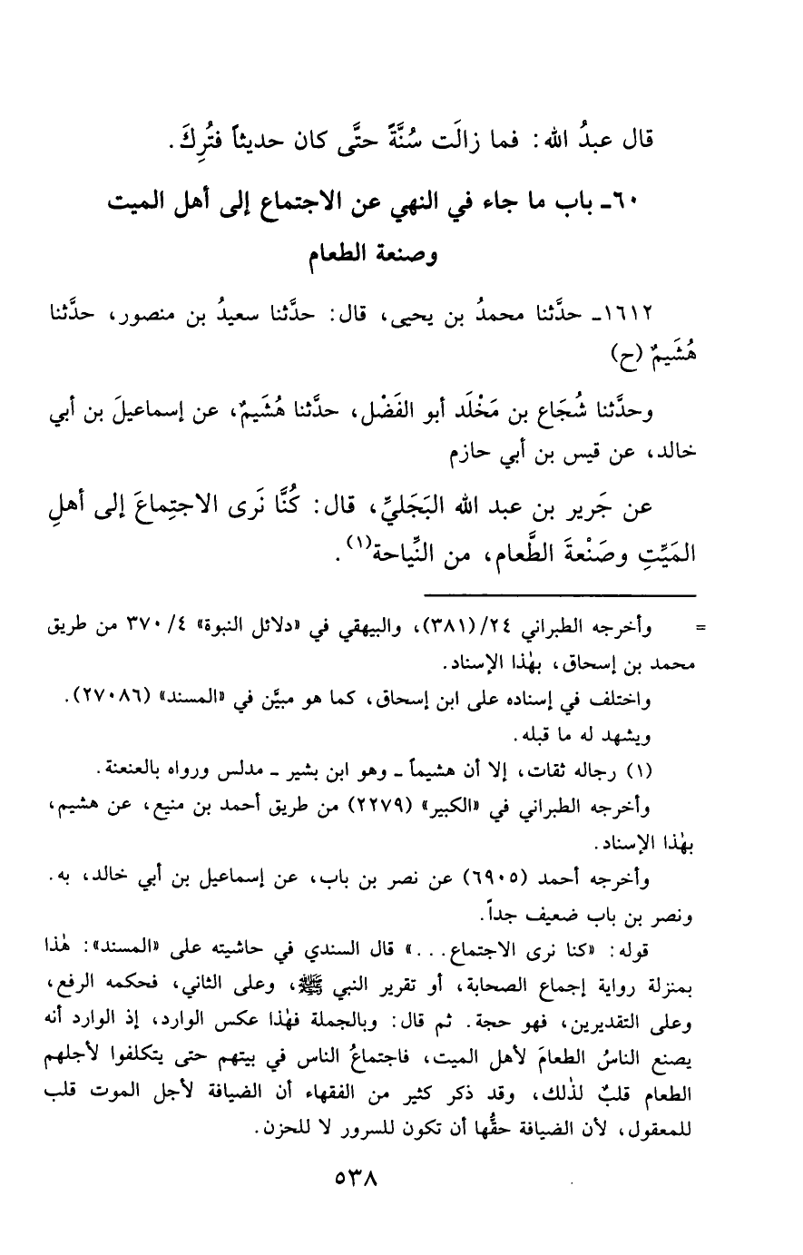 1612- حَدَّثَنَا مُحَمَّدُ بْنُ يَحْيَى ، قَالَ : حَدَّثَنَا سَعِيدُ بْنُ مَنْصُورٍ ، حَدَّثَنَا هُشَيْمٌ (ح) وحَدَّثَنَا شُجَاعُ بْنُ مَخْلَدٍ أَبُو الْفَضْلِ ، حَدَّثَنَا هُشَيْمٌ ، عَنْ إِسْمَاعِيلَ بْنِ أَبِي خَالِدٍ ، عَنْ قَيْسِ بْنِ أَبِي حَازِمٍ ، عَنْ جَرِيرِ بْنِ عَبْدِ اللهِ الْبَجَلِيِّ ، قَالَ : كُنَّا نَرَى الاِجْتِمَاعَ إِلَى أَهْلِ الْمَيِّتِ وَصَنْعَةَ الطَّعَامِ مِنَ النِّيَاحَةِ.