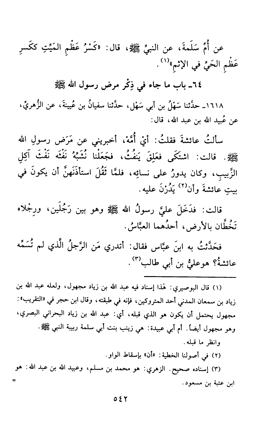 1618- حَدَّثَنَا سَهْلُ بْنُ أَبِي سَهْلٍ ، حَدَّثَنَا سُفْيَانُ بْنُ عُيَيْنَةَ ، عَنِ الزُّهْرِيِّ ، عَنْ عُبَيْدِ اللهِ بْنِ عَبْدِ اللهِ ، قَالَ : سَأَلْتُ عَائِشَةَ , فَقُلْتُ : أَيْ أُمَّهْ ، أَخْبِرِينِي عَنْ مَرَضِ رَسُولِ اللهِ صَلَّى الله عَليْهِ وسَلَّمَ ، قَالَتْ : اشْتَكَى ، فَعَلِقَ يَنْفُثُ ، فَجَعَلْنَا نُشَبِّهُ نَفْثَهُ نَفْثَ آكِلِ الزَّبِيبِ ، وَكَانَ يَدُورُ عَلَى نِسَائِهِ ، فَلَمَّا ثَقُلَ , اسْتَأْذَنَهُنَّ أَنْ يَكُونَ فِي بَيْتِ عَائِشَةَ وَأَنْ يَدُرْنَ عَلَيْهِ.