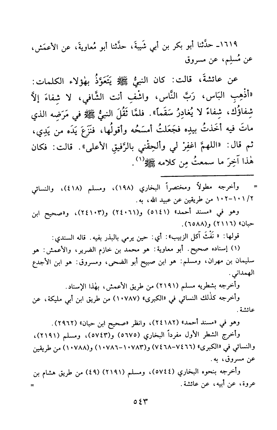 1619- حَدَّثَنَا أَبُو بَكْرِ بْنُ أَبِي شَيْبَةَ ، حَدَّثَنَا أَبُو مُعَاوِيَةَ ، عَنِ الأَعْمَشِ ، عَنْ مُسْلِمٍ ، عَنْ مَسْرُوقٍ ، عَنْ عَائِشَةَ ، قَالَتْ : كَانَ النَّبِيُّ صَلَّى الله عَليْهِ وسَلَّمَ يَتَعَوَّذُ بِهَؤُلاَءِ الْكَلِمَاتِ : أَذْهِبِ الْبَاسَ ، رَبَّ النَّاسِ ، وَاشْفِ أَنْتَ الشَّافِي ، لاَ شِفَاءَ إِلاَّ شِفَاؤُكَ ، شِفَاءً لاَ يُغَادِرُ سَقَمًا , فَلَمَّا ثَقُلَ النَّبِيُّ صَلَّى الله عَليْهِ وسَلَّمَ فِي مَرَضِهِ الَّذِي مَاتَ فِيهِ ، أَخَذْتُ بِيَدِهِ ، فَجَعَلْتُ أَمْسَحُهُ وَأَقُولُهَا ، فَنَزَعَ يَدَهُ مِنْ يَدِي ، ثُمَّ قَالَ : اللَّهُمَّ اغْفِرْ لِي ، وَأَلْحِقْنِي بِالرَّفِيقِ الأَعْلَى , قَالَتْ : فَكَانَ هَذَا آخِرَ مَا سَمِعْتُ مِنْ كَلاَمِهِ , صَلَّى الله عَليْهِ وسَلَّمَ.