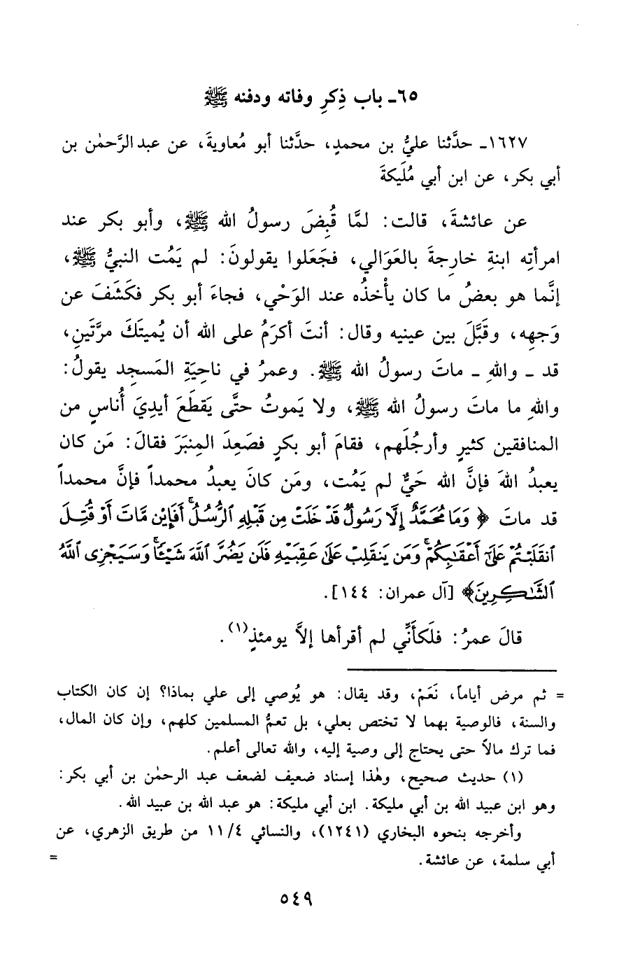 1627- حَدَّثَنَا عَلِيُّ بْنُ مُحَمَّدٍ ، حَدَّثَنَا أَبُو مُعَاوِيَةَ ، عَنْ عَبْدِ الرَّحْمَنِ بْنِ أَبِي بَكْرٍ ، عَنِ ابْنِ أَبِي مُلَيْكَةَ ، عَنْ عَائِشَةَ ، قَالَتْ : لَمَّا قُبِضَ رَسُولُ اللهِ صَلَّى الله عَليْهِ وسَلَّمَ وَأَبُو بَكْرٍ عِنْدَ امْرَأَتِهِ ، ابْنَةِ خَارِجَةَ بِالْعَوَالِي ، فَجَعَلُوا يَقُولُونَ : لَمْ يَمُتِ النَّبِيُّ صَلَّى الله عَليْهِ وسَلَّمَ ، إِنَّمَا هُوَ بَعْضُ مَا كَانَ يَأْخُذُهُ عِنْدَ الْوَحْيِ ، فَجَاءَ أَبُو بَكْرٍ ، فَكَشَفَ عَنْ وَجْهِهِ , وَقَبَّلَ بَيْنَ عَيْنَيْهِ , وَقَالَ : أَنْتَ أَكْرَمُ عَلَى اللهِ أَنْ يُمِيتَكَ مَرَّتَيْنِ ، قَدْ وَاللَّهِ مَاتَ رَسُولُ اللهِ صَلَّى الله عَليْهِ وسَلَّمَ , وَعُمَرُ فِي نَاحِيَةِ الْمَسْجِدِ يَقُولُ : وَاللَّهِ مَا مَاتَ رَسُولُ اللهِ صَلَّى الله عَليْهِ وسَلَّمَ ، وَلاَ يَمُوتُ حَتَّى يَقْطَعَ أَيْدِيَ أُنَاسٍ مِنَ الْمُنَافِقِينَ كَثِيرٍ وَأَرْجُلَهُمْ ، فَقَامَ أَبُو بَكْرٍ ، فَصَعِدَ الْمِنْبَرَ فَقَالَ : مَنْ كَانَ يَعْبُدُ اللَّهَ , فَإِنَّ اللَّهَ حَيٌّ لَمْ يَمُتْ ، وَمَنْ كَانَ يَعْبُدُ مُحَمَّدًا , فَإِنَّ مُحَمَّدًا قَدْ مَاتَ {وَمَا مُحَمَّدٌ إِلاَّ رَسُولٌ قَدْ خَلَتْ مِنْ قَبْلِهِ الرُّسُلُ أَفَإِنْ مَاتَ أَوْ قُتِلَ انْقَلَبْتُمْ عَلَى أَعْقَابِكُمْ وَمَنْ يَنْقَلِبْ عَلَى عَقِبَيْهِ فَلَنْ يَضُرَّ اللَّهَ شَيْئًا وَسَيَجْزِي اللَّهُ الشَّاكِرِينَ}.