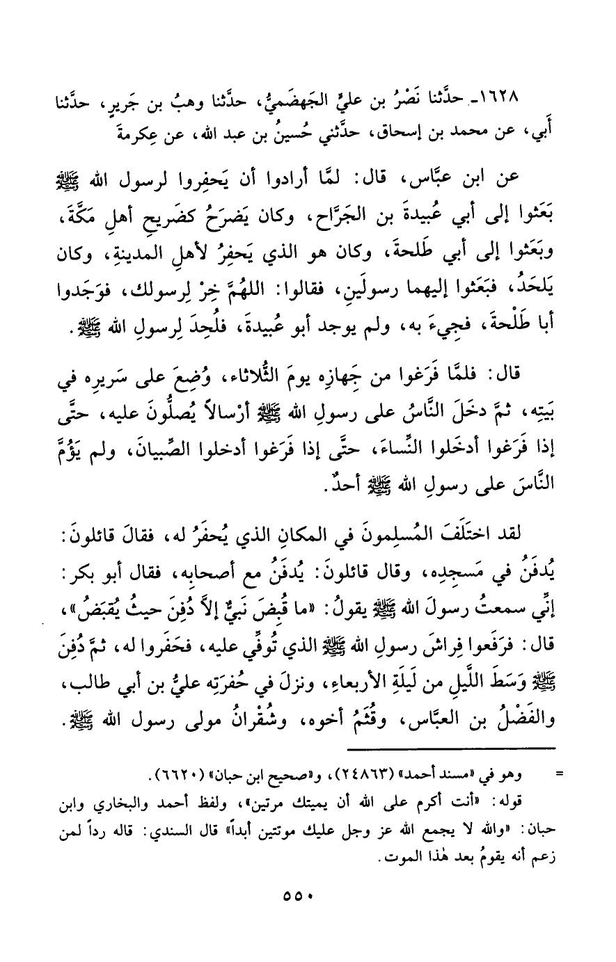 1628- حَدَّثَنَا نَصْرُ بْنُ عَلِيٍّ الْجَهْضَمِيُّ ، حَدَّثَنَا وَهْبُ بْنُ جَرِيرٍ ، حَدَّثَنَا أَبِي ، عَنْ مُحَمَّدِ بْنِ إِسْحَاقَ , حَدَّثَنِي حُسَيْنُ بْنُ عَبْدِ اللهِ ، عَنْ عِكْرِمَةَ ، عَنِ ابْنِ عَبَّاسٍ ، قَالَ : لَمَّا أَرَادُوا أَنْ يَحْفِرُوا لِرَسُولِ اللهِ صَلَّى الله عَليْهِ وسَلَّمَ ، بَعَثُوا إِلَى أَبِي عُبَيْدَةَ بْنِ الْجَرَّاحِ ، وَكَانَ يَضْرَحُ كَضَرِيحِ أَهْلِ مَكَّةَ ، وَبَعَثُوا إِلَى أَبِي طَلْحَةَ , وَكَانَ هُوَ الَّذِي يَحْفِرُ لأَهْلِ الْمَدِينَةِ ، وَكَانَ يَلْحَدُ ، فَبَعَثُوا إِلَيْهِمَا رَسُولَيْنِ ، فَقَالُوا : اللَّهُمَّ خِرْ لِرَسُولِكَ ، فَوَجَدُوا أَبَا طَلْحَةَ ، فَجِيءَ بِهِ ، وَلَمْ يُوجَدْ أَبُو عُبَيْدَةَ ، فَلُحِدَ لِرَسُولِ اللهِ صَلَّى الله عَليْهِ وسَلَّمَ.