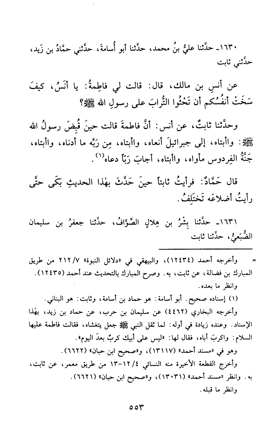 1630- حَدَّثَنَا عَلِيُّ بْنُ مُحَمَّدٍ ، حَدَّثَنَا أَبُو أُسَامَةَ , حَدَّثَنِي حَمَّادُ بْنُ زَيْدٍ , حَدَّثَنِي ثَابِتٌ ، عَنْ أَنَسِ بْنِ مَالِكٍ قَالَ : قَالَتْ لِي فَاطِمَةُ : يَا أَنَسُ , كَيْفَ سَخَتْ أَنْفُسُكُمْ أَنْ تَحْثُوا التُّرَابَ عَلَى رَسُولِ اللهِ صَلَّى الله عَليْهِ وسَلَّمَ ؟.