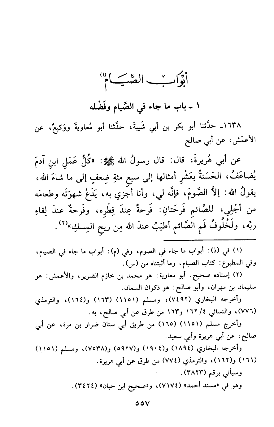 1638- حَدَّثَنَا أَبُو بَكْرِ بْنُ أَبِي شَيْبَةَ ، حَدَّثَنَا أَبُو مُعَاوِيَةَ ، وَوَكِيعٌ ، عَنِ الأَعْمَشِ ، عَنْ أَبِي صَالِحٍ ، عَنْ أَبِي هُرَيْرَةَ ، قَالَ : قَالَ رَسُولُ اللهِ صَلَّى الله عَليْهِ وسَلَّمَ : كُلُّ عَمَلِ ابْنِ آدَمَ يُضَاعَفُ ، الْحَسَنَةُ بِعَشْرِ أَمْثَالِهَا , إِلَى سَبْعِ مِئَةِ ضِعْفٍ , إِلَى مَا شَاءَ اللَّهُ ، يَقُولُ اللَّهُ : إِلاَّ الصَّوْمَ ؛ فَإِنَّهُ لِي وَأَنَا أَجْزِي بِهِ ، يَدَعُ شَهْوَتَهُ , وَطَعَامَهُ مِنْ أَجْلِي ، لِلصَّائِمِ فَرْحَتَانِ : فَرْحَةٌ عِنْدَ فِطْرِهِ ، وَفَرْحَةٌ عِنْدَ لِقَاءِ رَبِّهِ , وَلَخُلُوفُ فَمِ الصَّائِمِ , أَطْيَبُ عِنْدَ اللهِ مِنْ رِيحِ الْمِسْكِ.