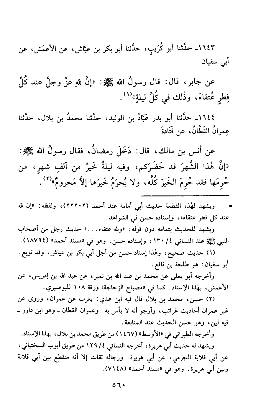 1643- حَدَّثَنَا أَبُو كُرَيْبٍ ، حَدَّثَنَا أَبُو بَكْرِ بْنُ عَيَّاشٍ ، عَنِ الأَعْمَشِ ، عَنْ أَبِي سُفْيَانَ ، عَنْ جَابِرٍ ، قَالَ : قَالَ رَسُولُ اللهِ صَلَّى الله عَليْهِ وسَلَّمَ : إِنَّ لِلَّهِ عَزَّ وَجَلَّ عِنْدَ كُلِّ فِطْرٍ عُتَقَاءَ ، وَذَلِكَ فِي كُلِّ لَيْلَةٍ.