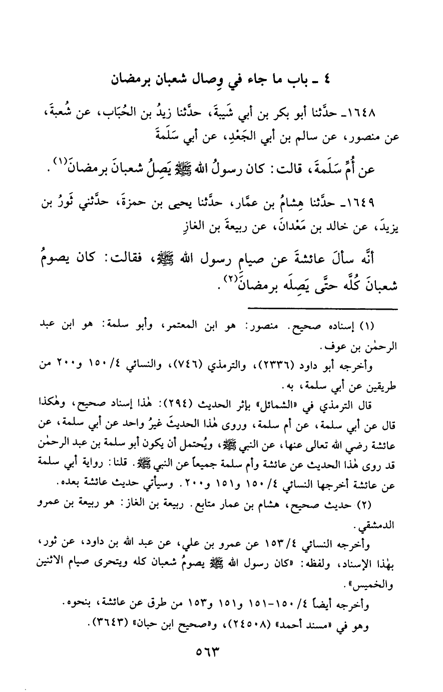 1648- حَدَّثَنَا أَبُو بَكْرِ بْنُ أَبِي شَيْبَةَ ، حَدَّثَنَا زَيْدُ بْنُ الْحُبَابِ ، عَنْ شُعْبَةَ ، عَنْ مَنْصُورٍ ، عَنْ سَالِمِ بْنِ أَبِي الْجَعْدِ ، عَنْ أَبِي سَلَمَةَ ، عَنْ أُمِّ سَلَمَةَ ، قَالَتْ : كَانَ رَسُولُ اللهِ صَلَّى الله عَليْهِ وسَلَّمَ يَصِلُ شَعْبَانَ بِرَمَضَانَ.