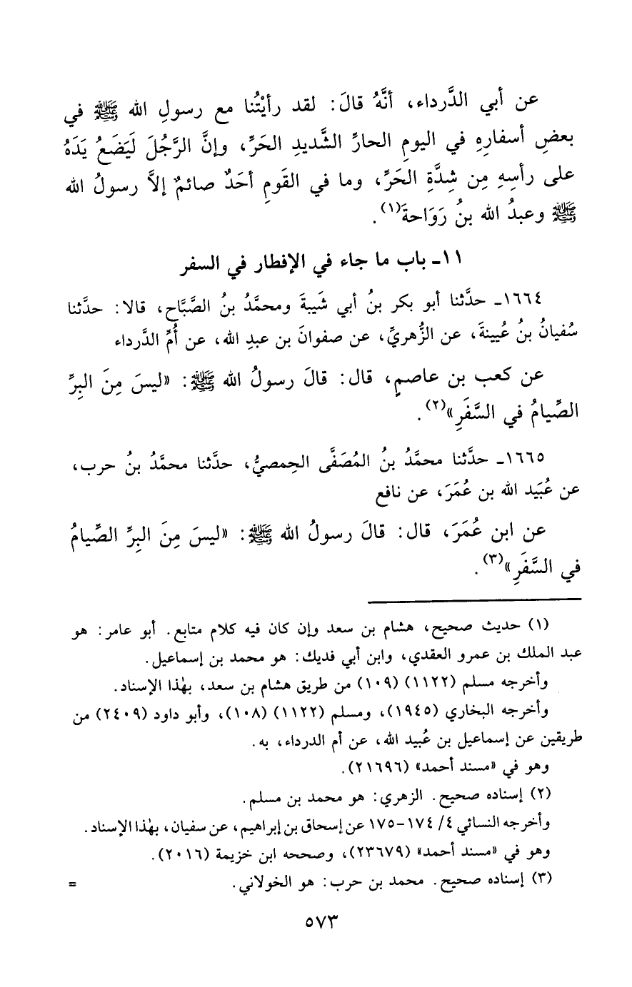 1664- حَدَّثَنَا أَبُو بَكْرِ بْنُ أَبِي شَيْبَةَ ، وَمُحَمَّدُ بْنُ الصَّبَّاحِ ، قَالاَ : حَدَّثَنَا سُفْيَانُ بْنُ عُيَيْنَةَ ، عَنِ الزُّهْرِيِّ ، عَنْ صَفْوَانَ بْنِ عَبْدِ اللهِ ، عَنْ أُمِّ الدَّرْدَاءِ ، عَنْ كَعْبِ بْنِ عَاصِمٍ ، قَالَ : قَالَ رَسُولُ اللهِ صَلَّى الله عَليْهِ وسَلَّمَ : لَيْسَ مِنَ الْبِرِّ الصِّيَامُ فِي السَّفَرِ.