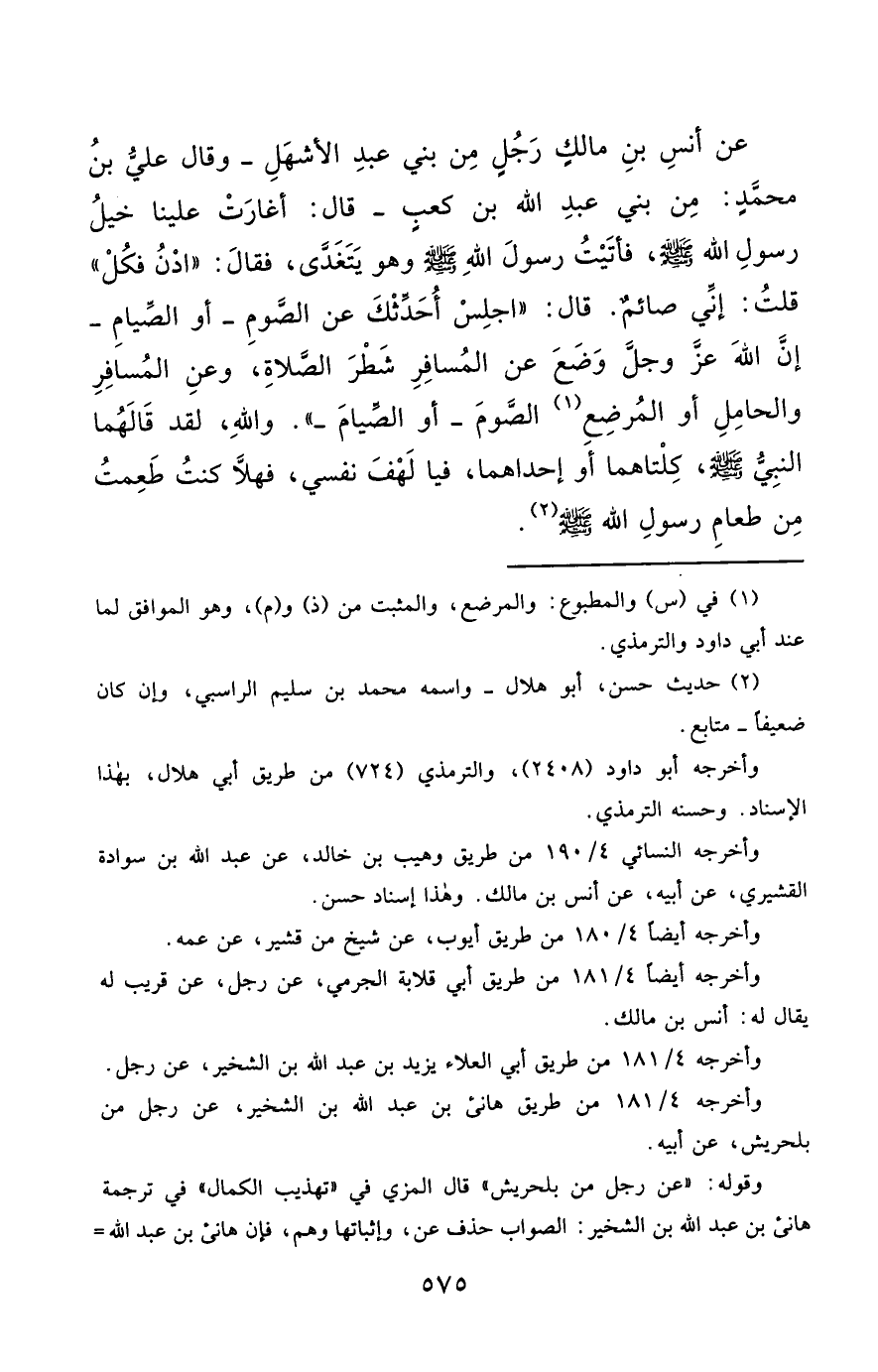 عَنْ أَنَسِ بْنِ مَالِكٍ، رَجُلٌ مِنْ بَنِي عَبْدِ الْأَشْهَلِ - وَقَالَ عَلِيُّ بْنُ مُحَمَّدٍ: مِنْ بَنِي عَبْدِ اللَّهِ بْنِ كَعْبٍ - قَالَ: أَغَارَتْ عَلَيْنَا خَيْلُ رَسُولِ اللَّهِ - صَلَّى اللَّهُ عَلَيْهِ وَسَلَّمَ -، فَأَتَيْتُ رَسُولَ اللَّهِ - صَلَّى اللَّهُ عَلَيْهِ وَسَلَّمَ - وَهُوَ يَتَغَدَّى، فَقَالَ: "ادْنُ فَكُل". قُلْتُ: إِنِّي صَائِمٌ. قَالَ: اجْلِسْ أُحَدِّثْكَ عَنْ الصَّوْمِ -أَوْ الصِّيَامِ- إِنَّ اللَّهَ عَزَّ وَجَلَّ وَضَعَ عَنْ الْمُسَافِرِ شَطْرَ الصَّلَاةِ، وَعَنْ الْمُسَافِرِ وَالْحَامِلِ أو الْمُرْضِعِ (¬1) الصَّوْمَ -أَوْ الصِّيَامَ-". وَاللَّهِ، لَقَدْ قَالَهُمَا النَّبِيُّ - صَلَّى اللَّهُ عَلَيْهِ وَسَلَّمَ -، كِلْتَاهُمَا أَوْ إِحْدَاهُمَا، فَيَا لَهْفَ نَفْسِي، فَهَلَّا كُنْتُ طَعِمْتُ مِنْ طَعَامِ رَسُولِ اللَّهِ - صَلَّى اللَّهُ عَلَيْهِ وَسَلَّمَ - (¬2).