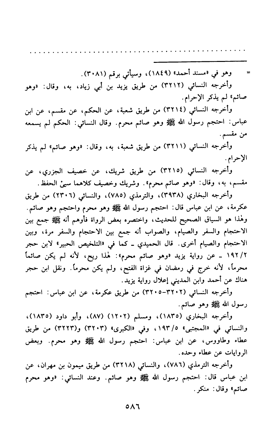 وهذا هو السياق الصحيح للحديث، واختصره بعض الرواة فأوهم أنه - صَلَّى اللَّهُ عَلَيْهِ وَسَلَّمَ - جمع بين الاحتجام والسفر والصيام، والصواب أنه جمع بين الاحتجام والسفر مرة، وبين الاحتجام والصيام أخرى. قال الحميدي- كما في "التلخيص الحبير" لابن حجر 2/ 192 - عن رواية يزيد "وهو صائم محرم": هذا ريح، لأنه لم يكن صائمًا محرمًا، لأنه خرج في رمضان في غزاة الفتح، ولم يكن محرمًا. ونقل ابن حجر هناك عن أحمد وابن المديني إعلال رواية يزيد.