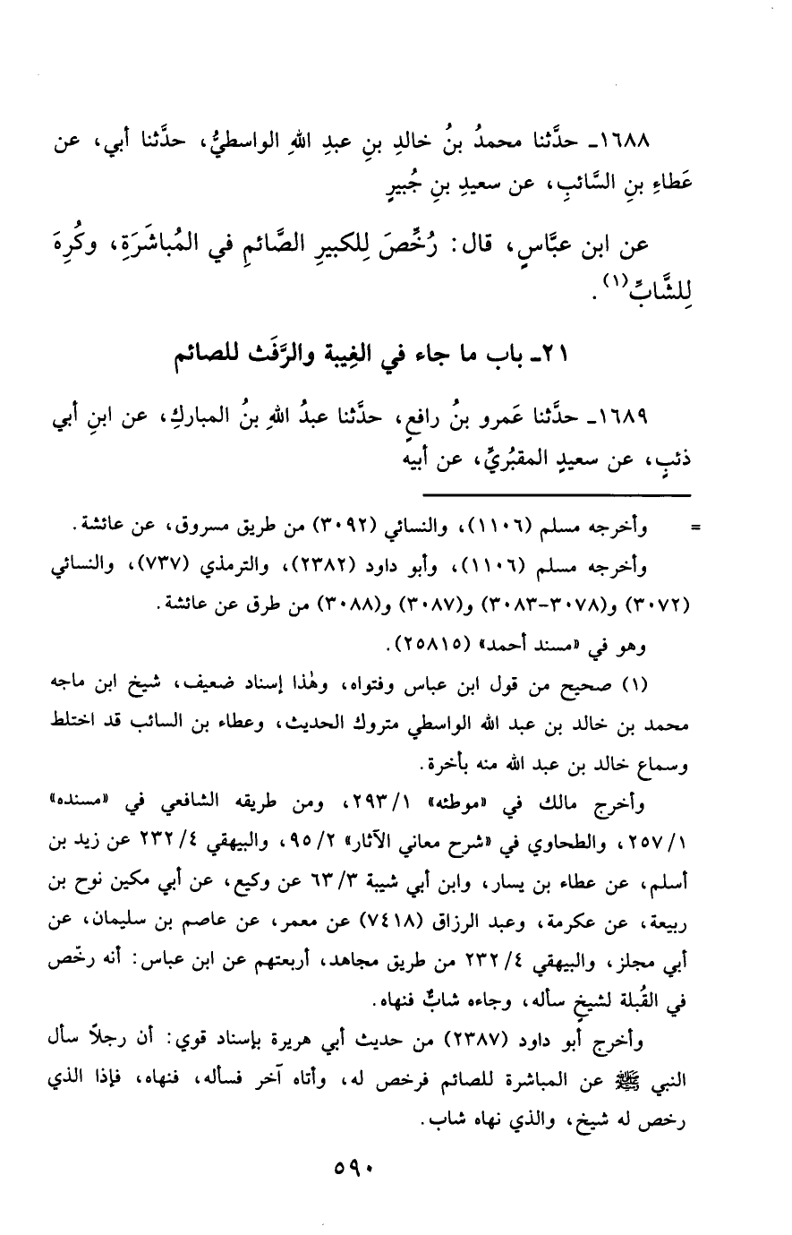 1688- حَدَّثَنَا مُحَمَّدُ بْنُ خَالِدِ بْنِ عَبْدِ اللهِ الْوَاسِطِيُّ ، حَدَّثَنَا أَبِي ، عَنْ عَطَاءِ بْنِ السَّائِبِ ، عَنْ سَعِيدِ بْنِ جُبَيْرٍ ، عَنِ ابْنِ عَبَّاسٍ ، قَالَ : رُخِّصَ لِلْكَبِيرِ الصَّائِمِ فِي الْمُبَاشَرَةِ ، وَكُرِهَ لِلشَّابِّ.