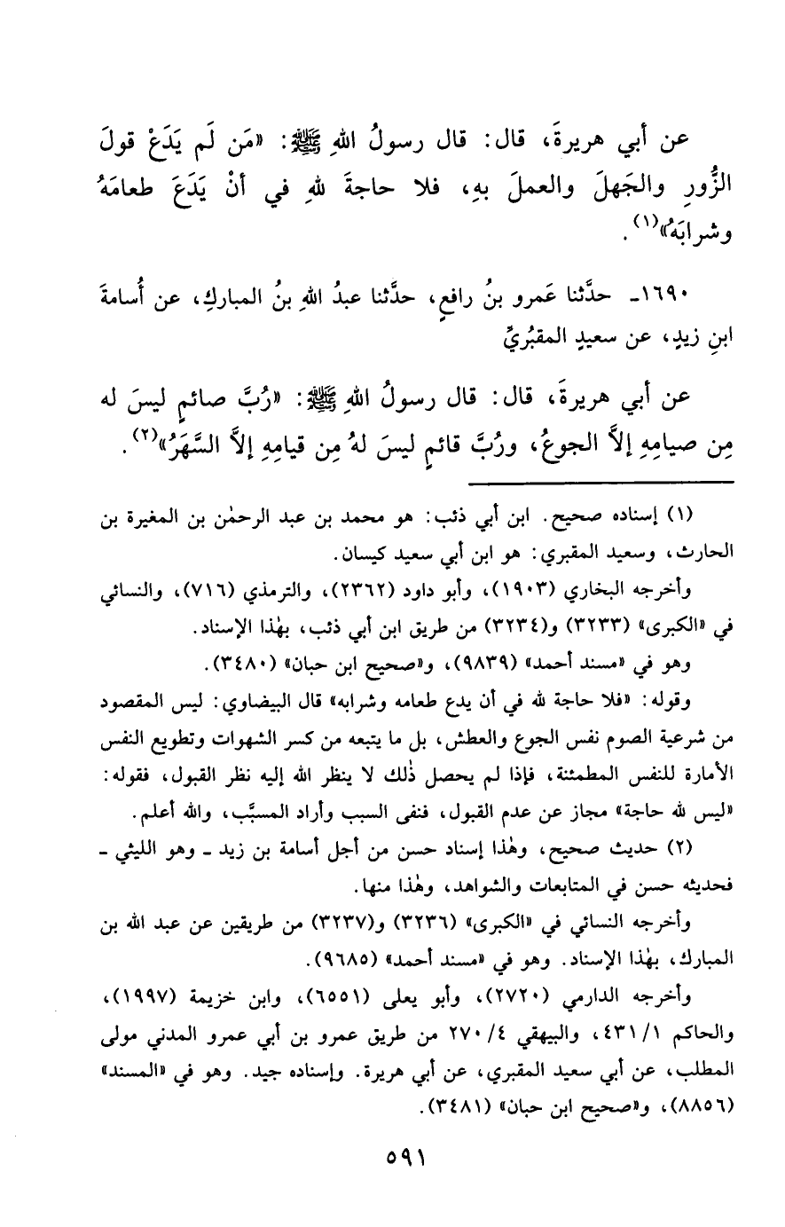 1690- حَدَّثَنَا عَمْرُو بْنُ رَافِعٍ ، حَدَّثَنَا عَبْدُ اللهِ بْنُ الْمُبَارَكِ ، عَنْ أُسَامَةَ بْنِ زَيْدٍ ، عَنْ سَعِيدٍ الْمَقْبُرِيِّ ، عَنْ أَبِي هُرَيْرَةَ ، قَالَ : قَالَ رَسُولُ اللهِ صَلَّى الله عَليْهِ وسَلَّمَ : رُبَّ صَائِمٍ لَيْسَ لَهُ مِنْ صِيَامِهِ إِلاَّ الْجُوعُ ، وَرُبَّ قَائِمٍ لَيْسَ لَهُ مِنْ قِيَامِهِ إِلاَّ السَّهَرُ.
