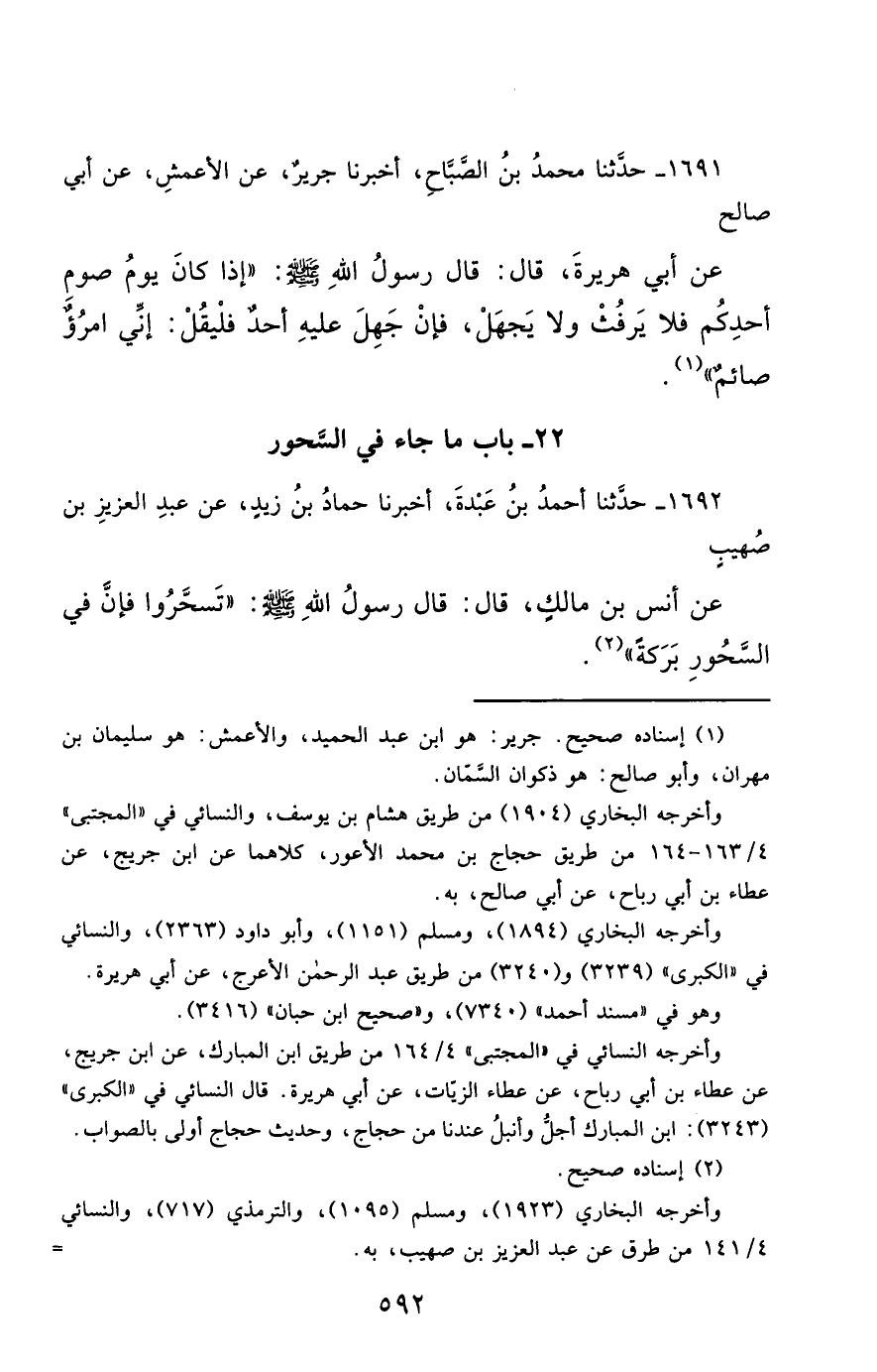1691- حَدَّثَنَا مُحَمَّدُ بْنُ الصَّبَّاحِ ، أَخْبَرَنَا جَرِيرٌ ، عَنِ الأَعْمَشِ ، عَنْ أَبِي صَالِحٍ ، عَنْ أَبِي هُرَيْرَةَ ، قَالَ : قَالَ رَسُولُ اللهِ صَلَّى الله عَليْهِ وسَلَّمَ : إِذَا كَانَ يَوْمُ صَوْمِ أَحَدِكُمْ ، فَلاَ يَرْفُثْ ، وَلاَ يَجْهَلْ ، فَإِنْ جَهِلَ عَلَيْهِ أَحَدٌ ، فَلْيَقُلْ : إِنِّي امْرُؤٌ صَائِمٌ.
