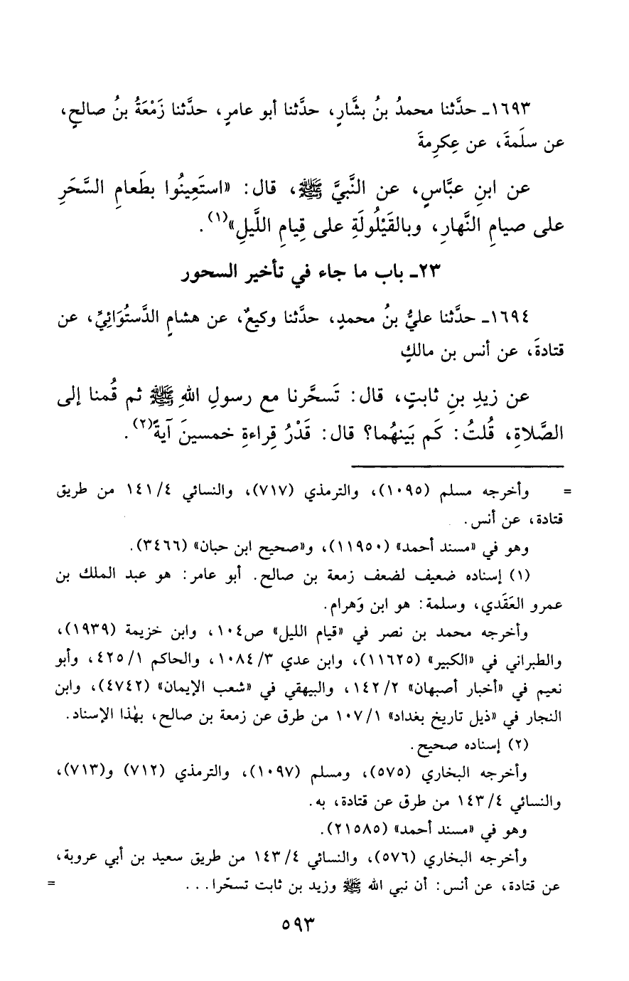 1693- حَدَّثَنَا مُحَمَّدُ بْنُ بَشَّارٍ ، حَدَّثَنَا أَبُو عَامِرٍ ، حَدَّثَنَا زَمْعَةُ بْنُ صَالِحٍ ، عَنْ سَلَمَةَ ، عَنْ عِكْرِمَةَ ، عَنِ ابْنِ عَبَّاسٍ ، عَنِ النَّبِيِّ صَلَّى الله عَليْهِ وسَلَّمَ قَالَ : اسْتَعِينُوا بِطَعَامِ السَّحَرِ عَلَى صِيَامِ النَّهَارِ ، وَبِالْقَيْلُولَةِ عَلَى قِيَامِ اللَّيْلِ.