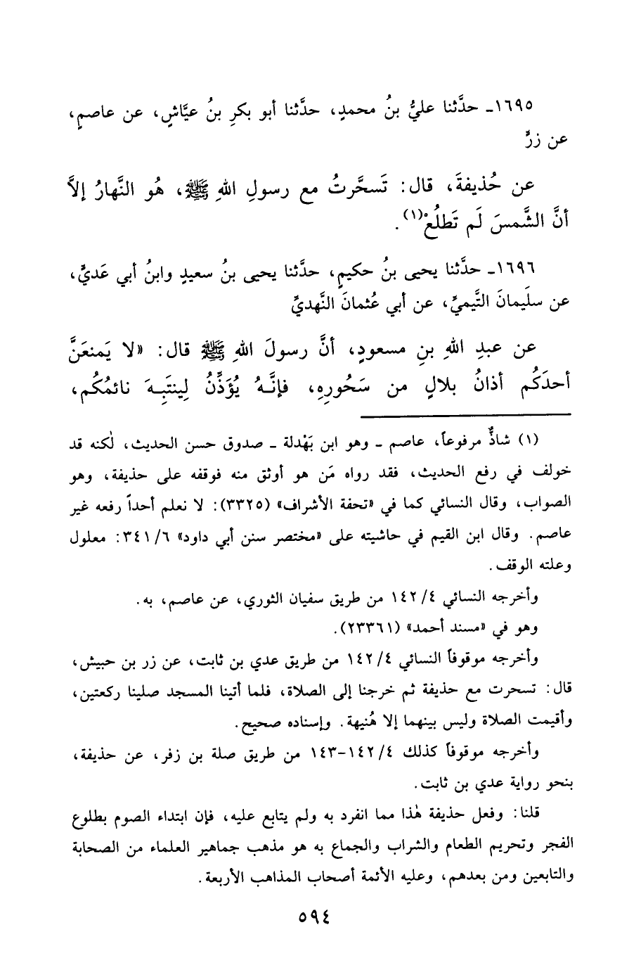 1695- حَدَّثَنَا عَلِيُّ بْنُ مُحَمَّدٍ ، حَدَّثَنَا أَبُو بَكْرِ بْنُ عَيَّاشٍ ، عَنْ عَاصِمٍ ، عَنْ زِرٍّ ، عَنْ حُذَيْفَةَ ، قَالَ : تَسَحَّرْتُ مَعَ رَسُولِ اللهِ صَلَّى الله عَليْهِ وسَلَّمَ هُوَ النَّهَارُ ، إِلاَّ أَنَّ الشَّمْسَ لَمْ تَطْلُعْ.