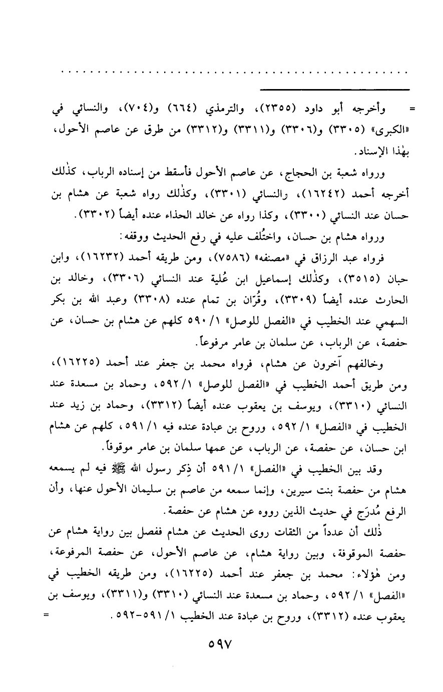 ذلك أن عددًا من الثقات روى الحديث عن هشام ففصل بين رواية هشام عن حفصة الموقوفة، وبين رواية هشام، عن عاصم الأحول، عن حفصة المرفوعة، ومن هؤلاء: محمَّد بن جعفر عند أحمد (16225)، ومن طريقه الخطيب في "الفصل" 1/ 592، وحماد بن مسعدة عند النسائي (3310) و (3311)، ويوسف بن يعقوب عنده (3312)، وروح بن عبادة عند الخطيب 1/ 591 - 592. =