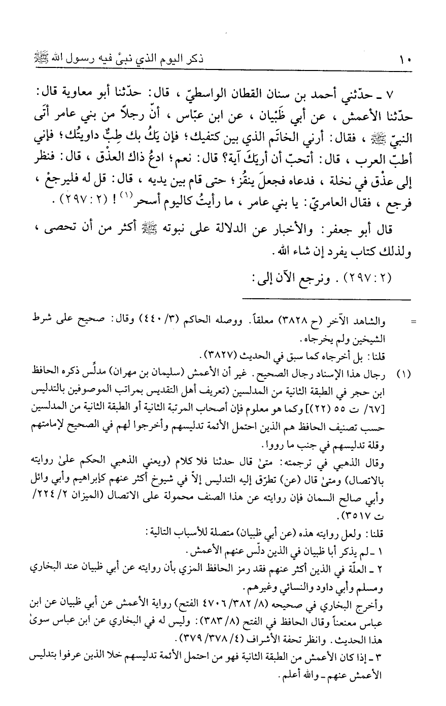 ٧ - حدّثني أحمد بن سنان القطان الواسطي، قال: حدَّثنا أبو معاوية قال: حدَّثنا الأعمش، عن أبي ظَبْيان، عن ابن عبّاس، أنّ رجلًا من بني عامر أتَى النبيّ - صلى الله عليه وسلم -، فقال: أرني الخاتَم الذي بين كتفيك؛ فإن يَكُ بك طِبٌّ داويتُك؛ فإني أطبّ العرب، قال: أتحبّ أن أريكَ آية؟ قال: نعم؟ ادعُ ذاك العذْق، قال: فنظر إلى عذْق في نخلة، فدعاه فجعلَ ينقُز؛ حتى قام بين يديه، قال: قل له فليرجعْ، فرجع، فقال العامريّ: يا بني عامر، ما رأيتُ كاليوم أسحر (١)! (٢: ٢٩٧).