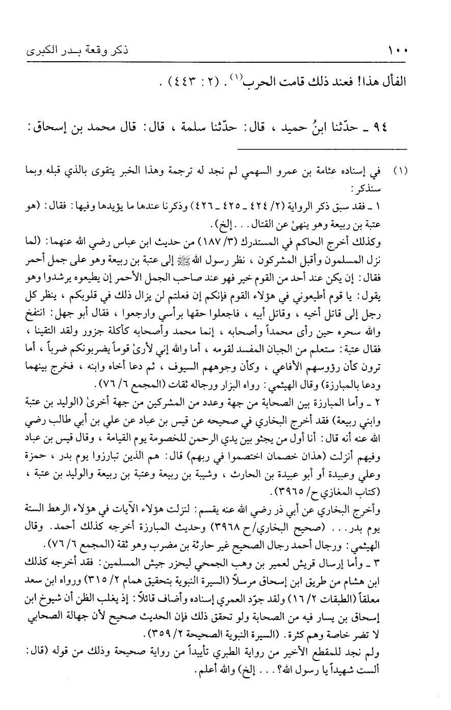 ١ - فقد سبق ذكر الرواية (٢/ ٤٢٤ - ٤٢٥ - ٤٢٦) وذكرنا عندها ما يؤيدها وفيها: فقال: (هو عتبة بن ربيعة وهو ينهى عن القتال ... إلخ).
