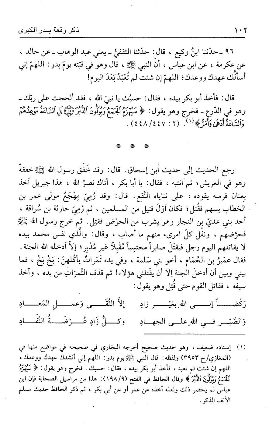قال: فأخذ أبو بكر بيده، فقال: حسبُك يا نبيّ الله، فقد ألححت على ربّك - وهو في الدّرع - فخرج وهو يقول: {سَيُهْزَمُ الْجَمْعُ وَيُوَلُّونَ الدُّبُرَ (٤٥) بَلِ السَّاعَةُ مَوْعِدُهُمْ وَالسَّاعَةُ أَدْهَى وَأَمَرُّ} (١). (٢: ٤٤٧/ ٤٤٨).