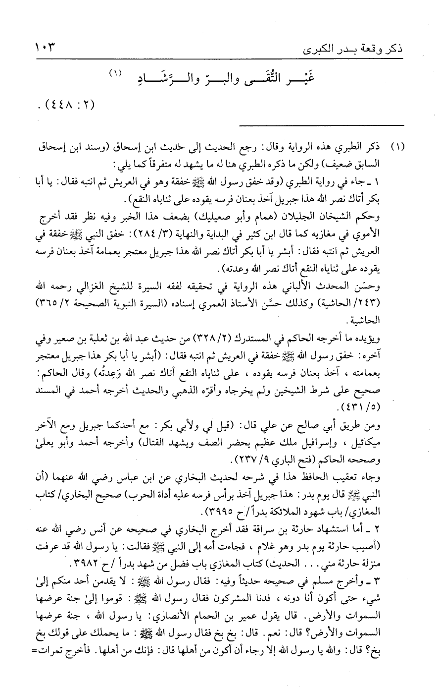 وحكم الشيخان الجليلان (همام وأبو صعيليك) بضعف هذا الخبر وفيه نظر فقد أخرج الأموي في مغازيه كما قال ابن كثير في البداية والنهاية (٣/ ٢٨٤): خفق النبي - صلى الله عليه وسلم - خفقة في العريش ثم انتبه فقال: أبشر يا أبا بكر أتاك نصر الله هذا جبريل معتجر بعمامة آخذ بعنان فرسه يقوده على ثناياه النقع أتاك نصر الله وعدته).