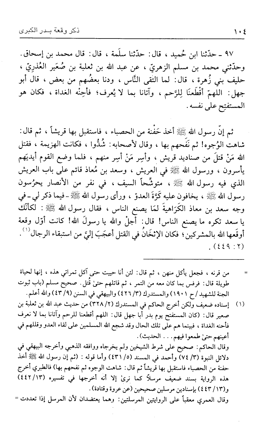 ٩٧ - حدَّثنا ابن حُميد، قال: حدَّثنا سلَمة، قال: قال محمد بن إسحاق. وحدّثني محمد بن مسلم الزهريّ، عن عبد الله بن ثعلبة بن صُعَير العُذرِيّ، حليف بني زُهرة، قال: لما التقى النَّاس، ودنا بعضُهم من بعض، قال أبو جهل: اللهمَّ أقْطَعنَا لِلرَّحم، وآتانا بما لا يُعرف؛ فأحِنْه الغداة، فكان هو المستفتِح على نفسه.
