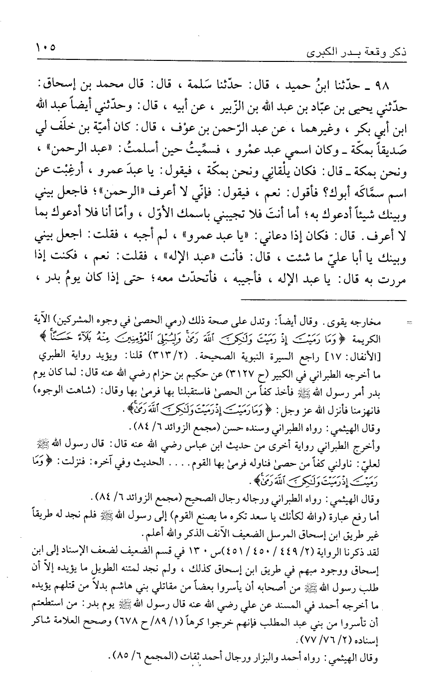 ٩٨ - حدَّثنا ابنُ حميد، قال: حدَّثنا سَلمة، قال: قال محمد بن إسحاق: حدّثني يحيى بن عبّاد بن عبد الله بن الزُّبَيْر، عن أبيه، قال: وحدّثني أيضًا عبد الله بن أبي بكر، وغيرهما، عن عبد الرّحمن بن عوْف، قال: كان أميّة بن خلَف لي صَديقًا بمكّة - وكان اسمي عبد عمْرو، فسمِّيتُ حين أسلمتُ: "عبد الرحمن"، ونحن بمكة - قال: فكان يلْقانِي ونحن بمكّة، فيقول: يا عبدَ عمرو، أرغِبْت عن اسم سمَّاكَه أبوك؟ فأقول: نعم، فيقول: فإنّي لا أعرف "الرحمن"؛ فاجعل بيني وبينك شيئًا أدعوك به؛ أما أنتَ فلا تجيبني باسمك الأوّل، وأمّا أنا فلا أدعوك بما لا أعرف. قال: فكان إذا دعاني: "يا عبد عمرو"، لم أجبه، فقلت: اجعل بيني وبينك يا أبا عليّ ما شئت، قال: فأنت "عبد الإله"، فقلت: نعم، فكنت إذا مررت به قال: يا عبد الإله، فأجيبه، فأتحدّث معه؛ حتى إذا كان يومُ بدر،