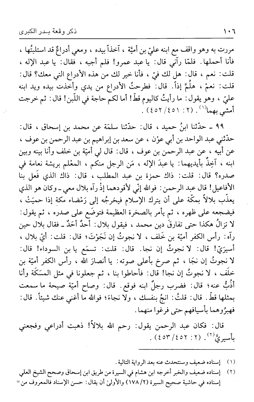 ٩٩ - حدَّثنا ابنُ حميد، قال: حدَّثنا سلمَة عن محمد بن إسحاق، قال: حدّثني عبد الواحد بن أبي عوْن، عن سعد بن إبراهيم بن عبد الرحمن بن عوف، عن أبيه، عن عبد الرحمن بن عوف، قال: قال لي أميّة بن خلف وأنا بينه وبين ابنه، آخِذٌ بأيديهما: يا عبدَ الإله، مَن الرجل منكم، المعْلم بريشة نعامة في صدره؟ قال: قلت: ذاك حمزة بن عبد المطلب، قال: ذاك الذي فَعل بنا الأفاعيل! قال عبد الرحمن: فوالله إنّي لأقودهما إذْ رآه بلال معي - وكان هو الذي يعذّب بلالًا بمكّة على أن يترك الإسلام فيخرجُه إلى رَمْضاء مكة إذا حميَتْ، فيضجعه على ظهره، ثم يأمر بالصخرة العظيمة فتوضع على صدره، ثم يقول: لا تزالُ هكذا حتى تفارقَ دين محمد، فيقول بلال: أحدٌ أحَدٌ - فقال بلال حين رآه: رأس الكفر أميّة بن خَلف، لا نجوتُ إن نَجَوْتَ؛ قال: قلت: أي بلال، أسيرَيّ! قال: لا نجوتُ إن نجا. قال: قلت: تسمَع يا بن السوداء! قال: لا نجوتُ إن نجَا، ثم صرخ بأعلى صوته: يا أنصارَ الله، رأس الكفر أمية بن خلَف، لا نجوتُ إن نجا! قال: فأحاطوا بنا، ثم جعلونا في مثل المسَكَة وأنا أذُبُّ عنه؛ قال: فضرب رجلٌ ابنه فوقع. قال: وصاح أميّة صيحة ما سمعت بمثلها قطّ. قال: قلتُ: انجُ بنفسك، ولا نجاءَ؛ فوالله ما أغني عنك شيئًا. قال: فهبرُوهما بأسيافهم حتى فرغوا منهما.