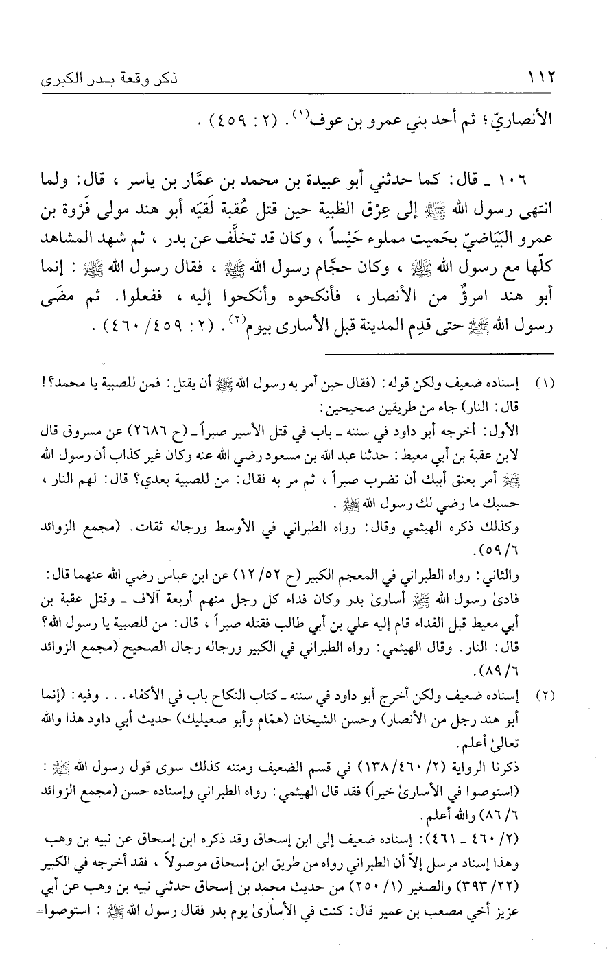 ١٠٦ - قال: كما حدثني أبو عبيدة بن محمد بن عمَّار بن ياسر، قال: ولما انتهى رسول الله - صلى الله عليه وسلم - إلى عِرْق الظبية حين قتل عُقبة لَقيَه أبو هند مولى فَرْوة بن عمرو البَيَاضيّ بحَميت مملوء حَيسًا، وكان قد تخلَّف عن بدر، ثم شهد المشاهد كلّها مع رسول الله - صلى الله عليه وسلم -، وكان حجَّام رسول الله - صلى الله عليه وسلم -، فقال رسول الله - صلى الله عليه وسلم -: إنما أبو هند امرؤٌ من الأنصار، فأنكحوه وأنكحوا إليه، ففعلوا. ثم مضَى رسول الله - صلى الله عليه وسلم - حتى قدِم المدينة قبل الأسارى بيوم (٢). (٢: ٤٥٩/ ٤٦٠).