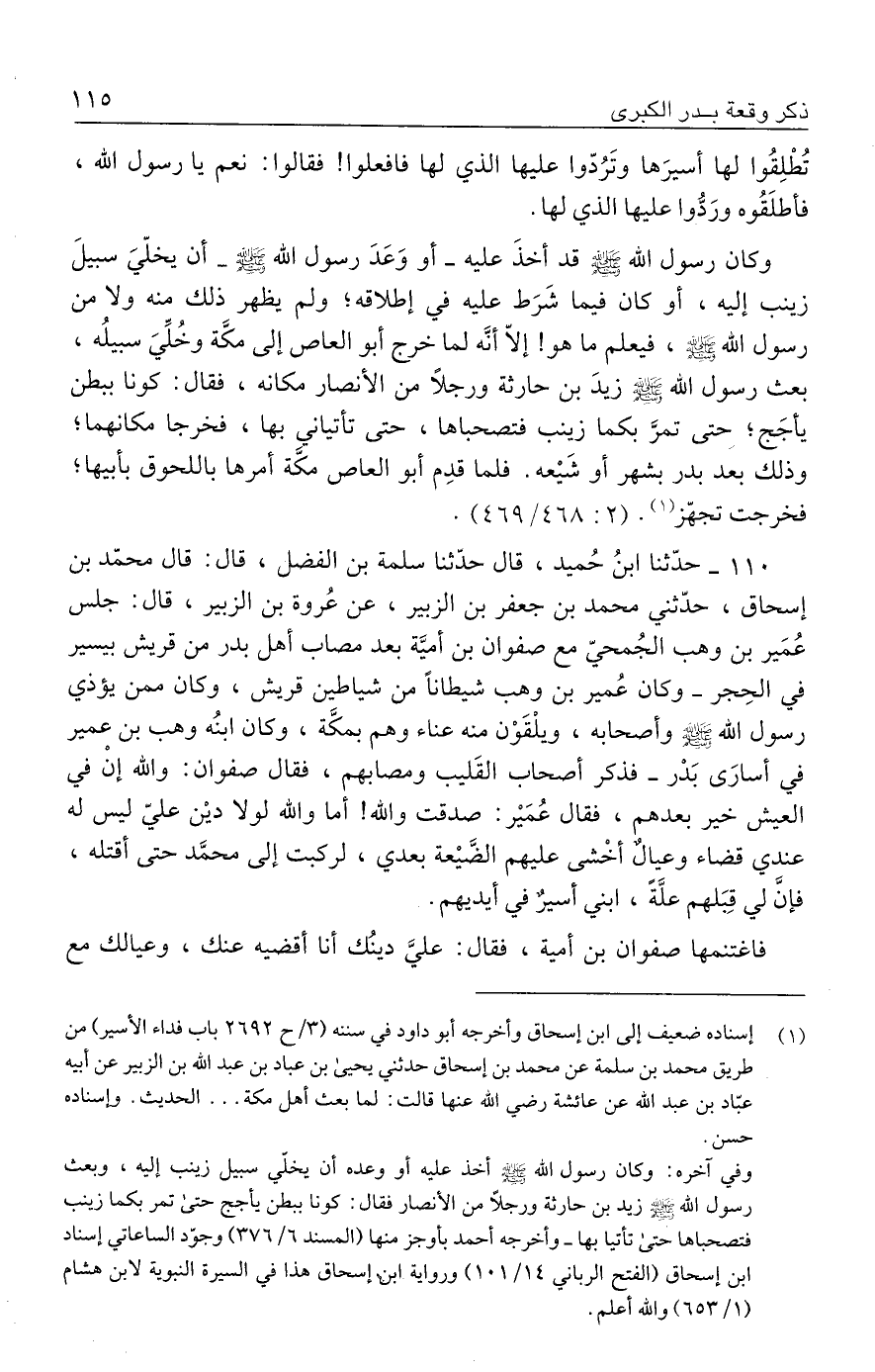 ١١٠ - حدَّثنا ابنُ حُميد، قال حدَّثنا سلمة بن الفضل، قال: قال محمّد بن إسحاق، حدّثني محمد بن جعفر بن الزبير، عن عُروة بن الزبير، قاله: جلس عُمَير بن وهب الجُمحيّ مع صفوان بن أميَّة بعد مصاب أهل بدر من قريش بيسير في الحِجر -وكان عُمير بن وهب شيطانًا من شياطين قريش، وكان ممن يؤذي رسول الله - صلى الله عليه وسلم - وأصحابه، ويلْقَوْن منه عناء وهم بمكَّة، وكان ابنُه وهب بن عمير في أسارَى بَدْر- فذكر أصحاب القَليب ومصابهم، فقال صفوان: والله إنْ في العيش خير بعدهم، فقال عُمَير: صدقت والله! أما والله لولا دين عليّ ليس له عندي قضاء وعيالٌ أخْشى عليهم الضَّيعة بعدي، لركبت إلى محمَّد حتى أقتله، فإنَّ لي قِبَلهم علَّةً، ابني أسيرٌ في أيديهم.